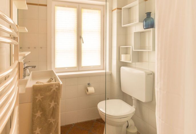 Im Obergeschoss: 1 Schlafzimmer mit Doppelbett (zweiter Fernseher), 1 Schlafzimmer mit 2 Einzelbetten, kleines Wannenbad/WC mit Fenster.