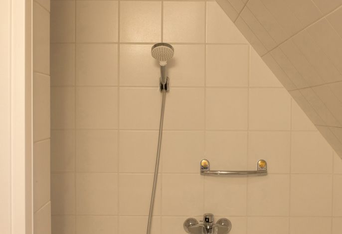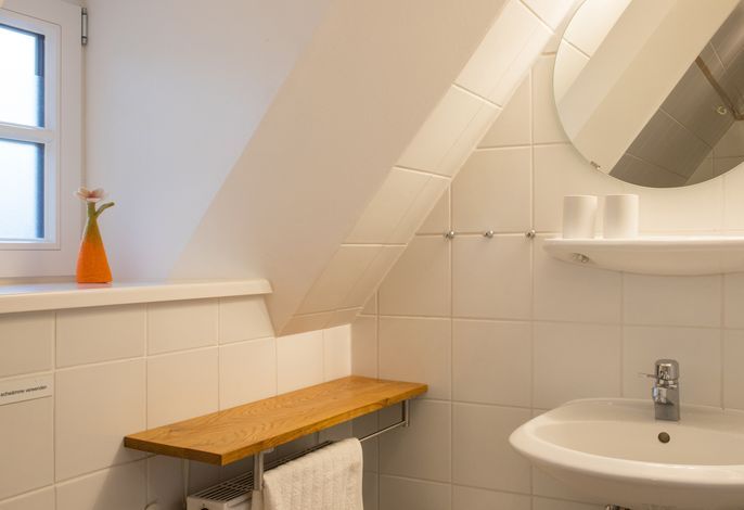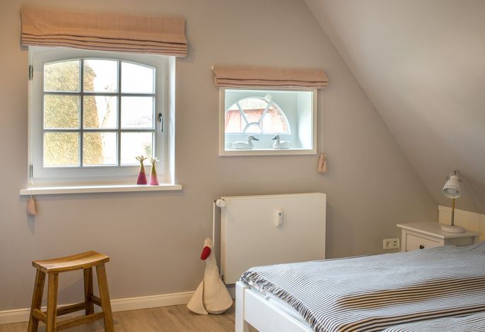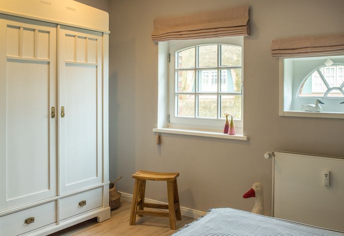 Im Obergeschoss: 1 Schlafzimmer mit Doppelbett (zweiter Fernseher), 1 Schlafzimmer mit 2 Einzelbetten, kleines Wannenbad/WC mit Fenster.