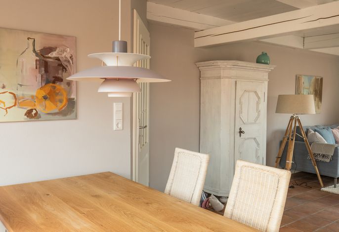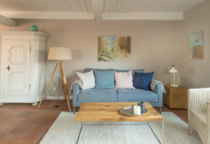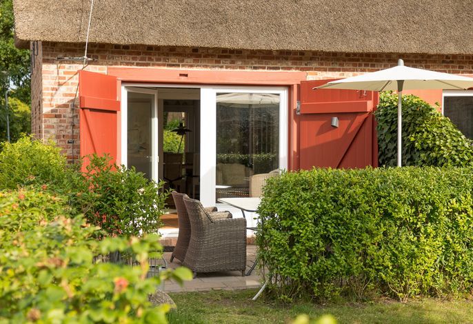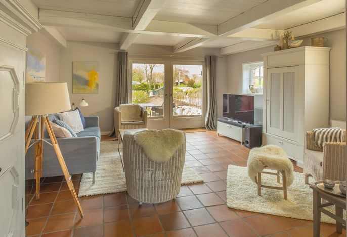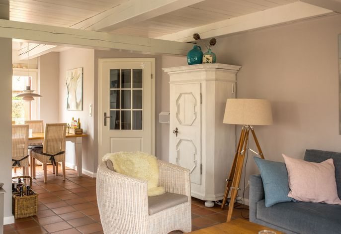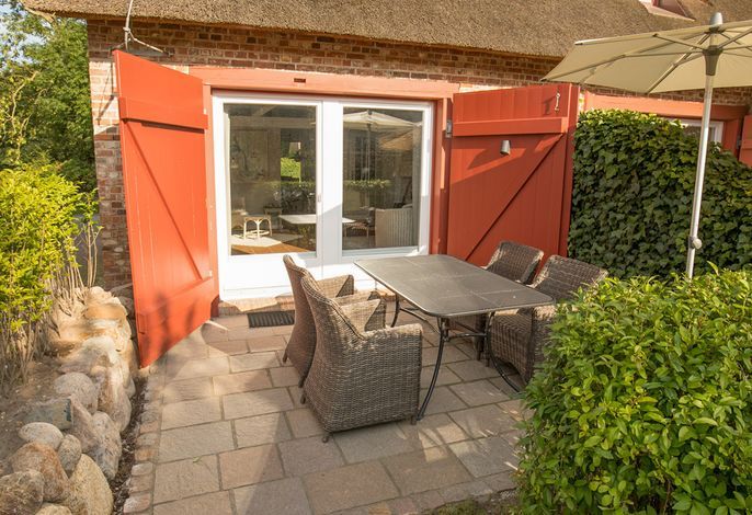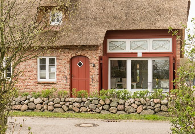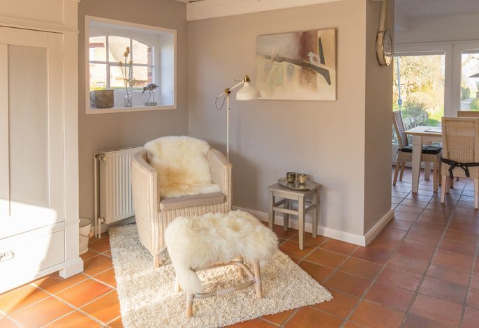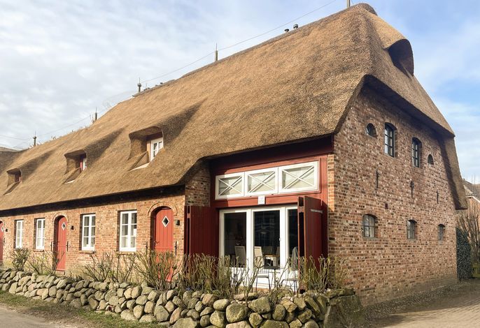 Willkommen im gepflegten Endhausteil Foftein in Borgsum auf Föhr. Im Nordwestgiebel des reetgedeckten Hauses mit mehreren Hausteilen erwartet Sie eine großzügige Unterkunft über zwei Etagen mit separatem Eingang und eigenem PKW-Stellplatz.