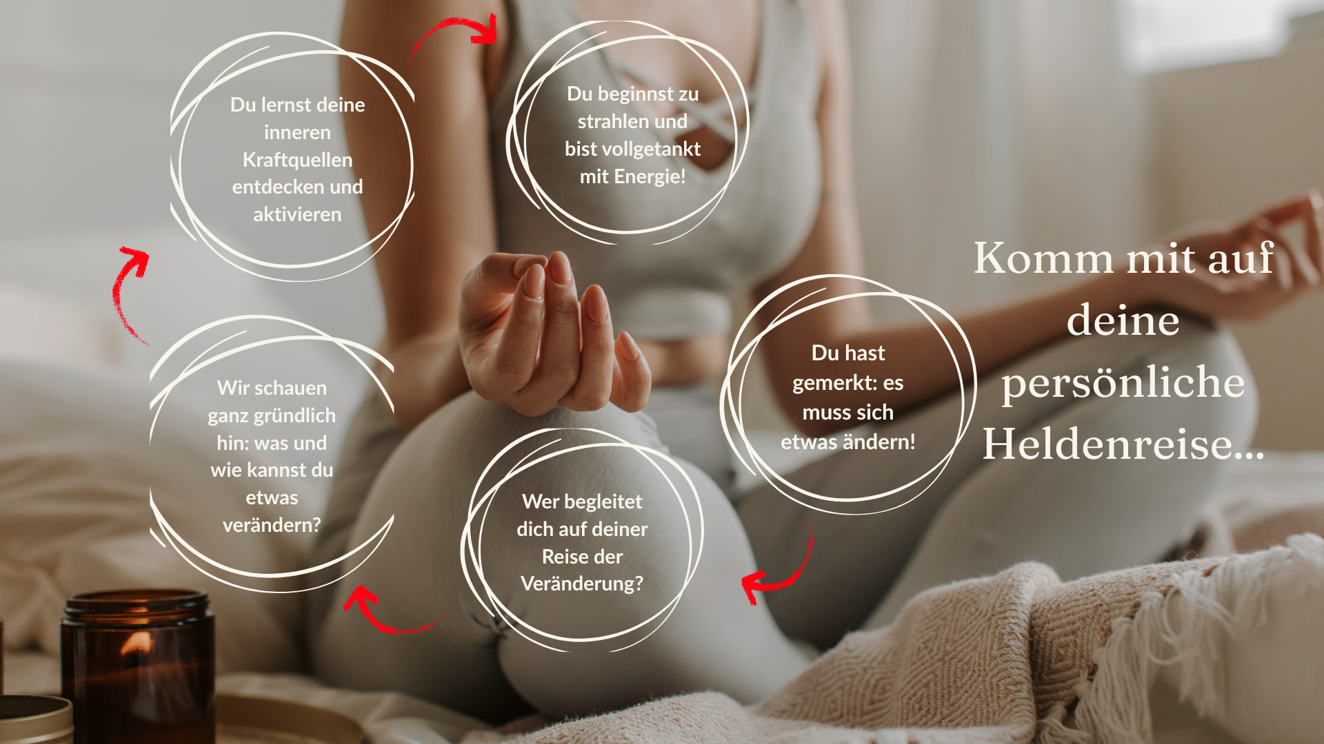 Gemeinsam mit einer kleinen Gruppe Gleichgesinnter (max. 12 Teilnehmerinnen) begibst du dich auf deine persönliche Heldinnenreise – von Erschöpfung zu innerer Stärke.
