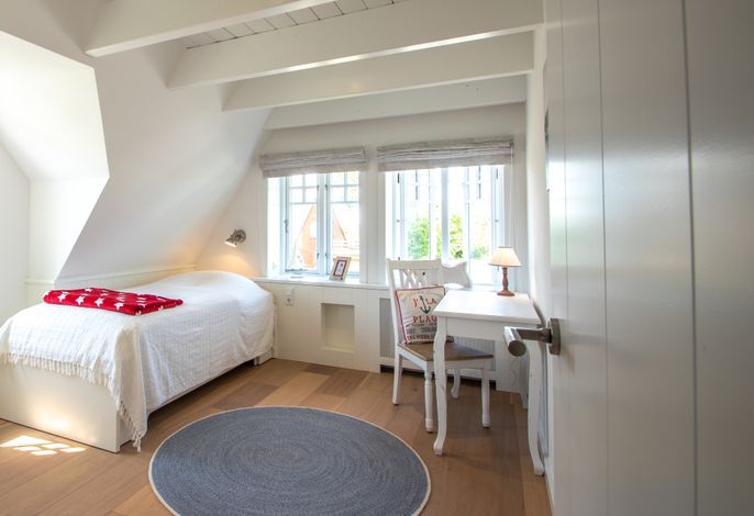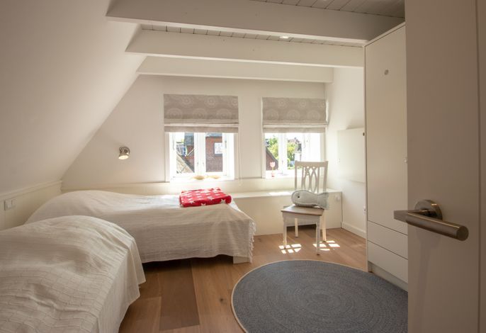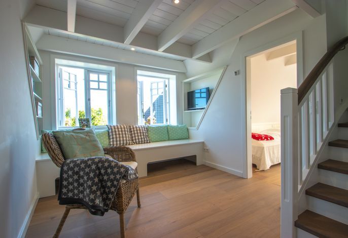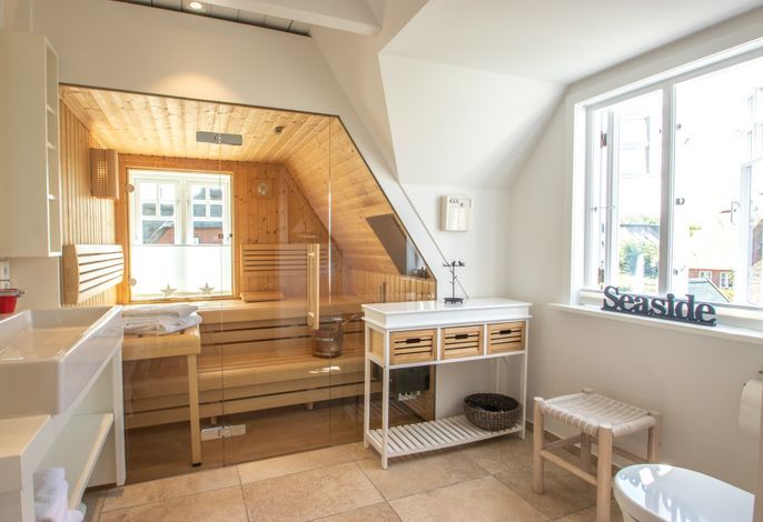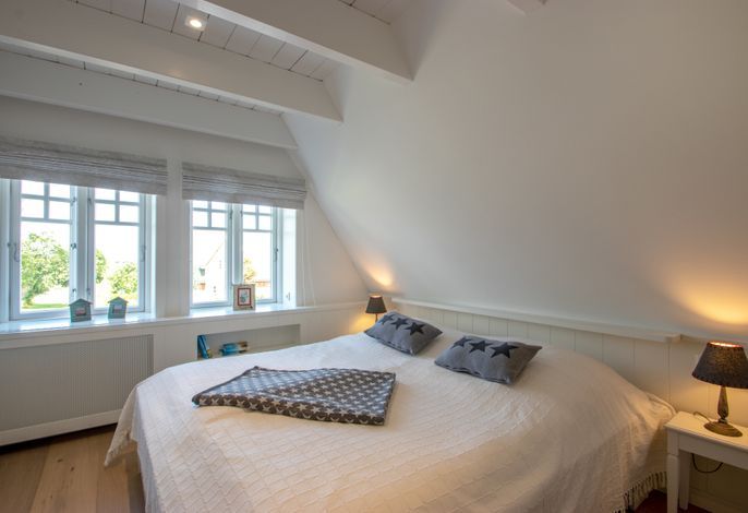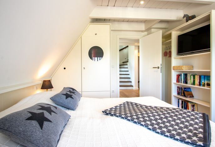 Im Obergeschoss befinden sich drei Schlafzimmer, eines davon mit einem Doppelbett (Breite 1,80 m). Die beiden Einzelbetten des zweiten Schlafzimmers können zu einem Doppelbett zusammengeschoben werden. Das ausziehbare Einzelbett des dritten Schlafzimmers kann in ein Doppelbett verwandelt werden. Ferner befindet sich hier das komfortable Hauptbad mit Badewanne, Dusche, Doppelwaschbecken und als Highlight eine Sauna mit Außenfenster. Der geräumige Flur wurde gemütlich mit Lese- und Fernsehecke eingerichtet (weitere Fernsehmöglichkeiten im Wohnzimmer und in einem der Schlafzimmer).
