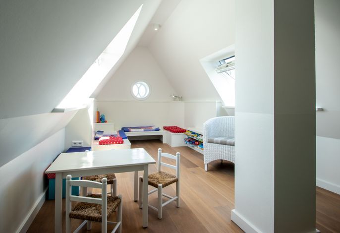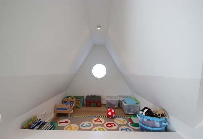 Auch im ausgebauten Spitzboden werden sich Groß und Klein sicher wohlfühlen: Die einen genießen die Aussicht, die anderen haben hier Platz zum Spielen. Eine Auswahl an Spielsachen stehen für Ihre Kinder zur Verfügung (Ritterburg, Lego u. a.).