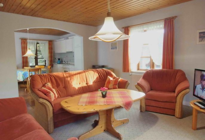 Unsere familienfreundliche, geschmackvoll eingerichtete Ferienwohnung mit großzügiger Terrasse ist komplett ausgestattet mit 2 Schlafzimmern, die über Doppelbetten verfügen, einem großen Wohnzimmer mit Zugang zur eigenen Terrasse, ein Badezimmer sowie einer voll ausgestatteten Küche. Das geräumige Wohnzimmer mit angrenzender Küche lädt zu gemütlichen Abendstunden ein.