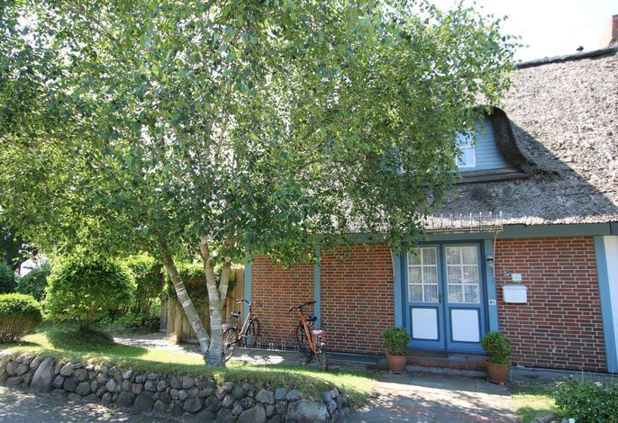 Ferienwohnung in Wyk auf Föhr, Ginsterweg 2a, Whg. Nr.1, Reetdachhaus in ruhiger Sackgasse, ca. 56 qm große 2-Zimmer-Nichtraucherwohnung im Erdgeschoß mit Holzterrasse nach Süden (Tisch mit 2 Stühlen, einer Sitzbank und 1 Liege + Strandkorb). WOHNZIMMER: Couch, 2 Sessel und Couchtisch, elektrischer Kachelofen für die kalten Wintertage, Esstisch mit 4 Stühlen und offene Küche mit Vollausstattung. SCHLAFZIMMER mit Doppelbett (2 x 2 m) und Kleiderschrank. BAD mit Wanne (Duschabtrennung) und WC. Fahrradständer und Parkplatz am Haus. Weitläufiger Garten mit altem Baumbestand und Blick aufs Meer. Zum Strand sind es nur wenige Schritte, zum Zentrum, Kurmittelhaus u. Wellenbad ca. 15 - 20 Minuten Fußweg. Die Wohnung ist hochwertig und gepflegt eingerichtet. Münzwaschmaschine und -trockner, Bügeleisen und Brett im Keller. Das Wohnzimmer ist mit Fliesen ausgelegt.