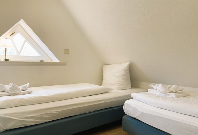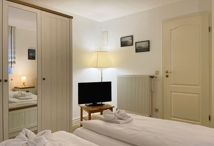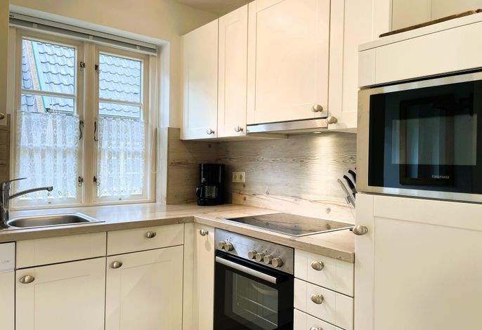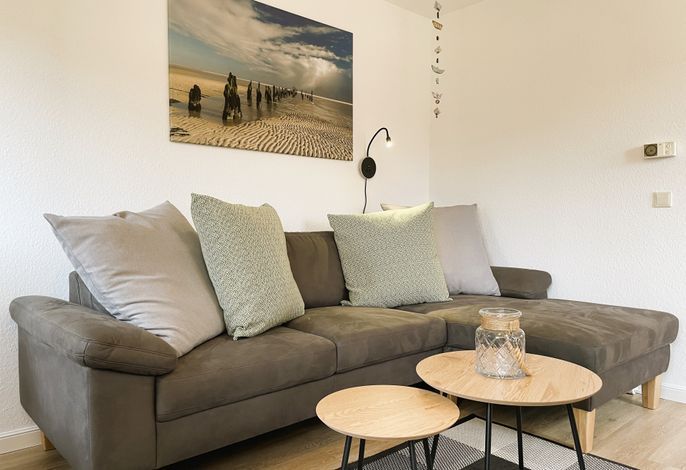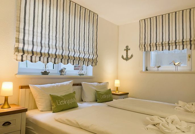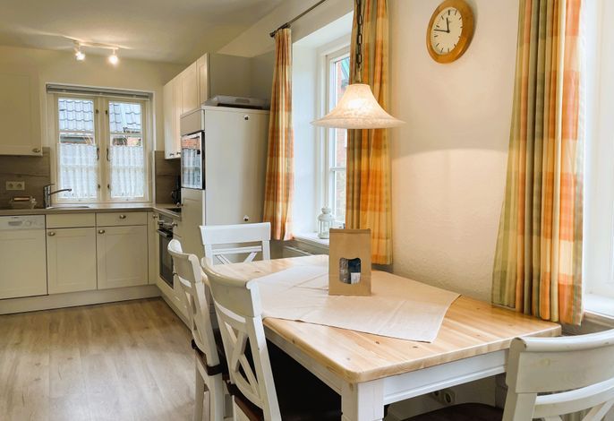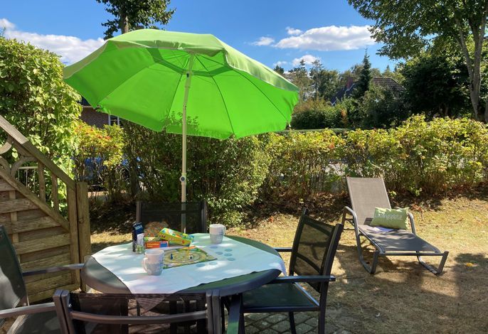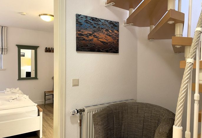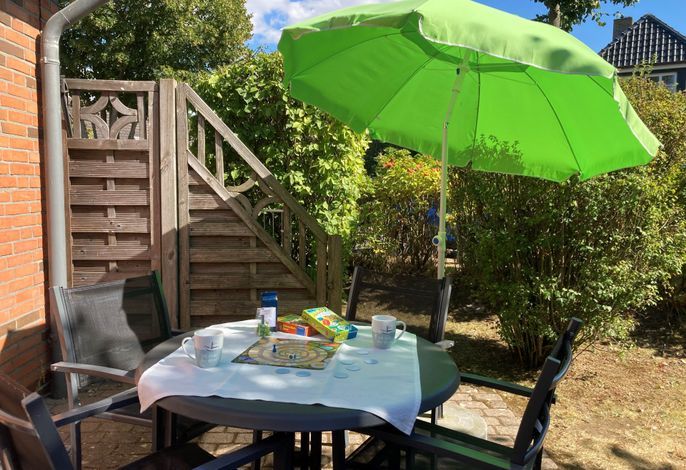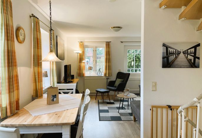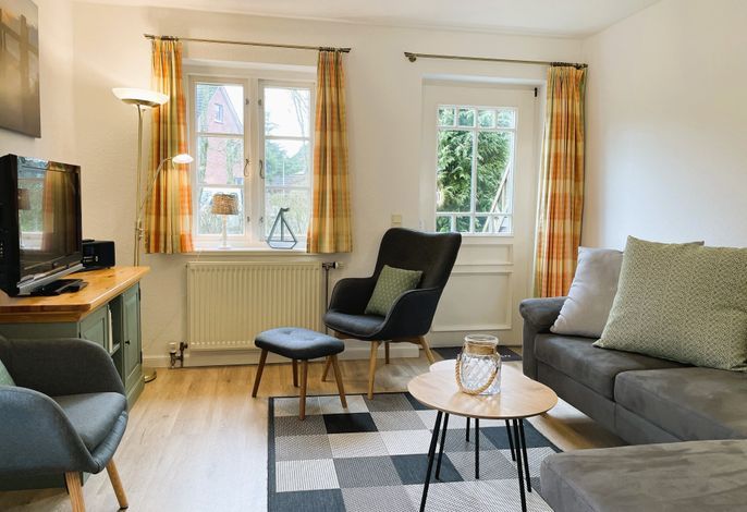 HARTELK WELKIMEN ÜÜS GREEN EILUN Herzlich Willkommen auf unserer grünen Insel! Durch die Reihenhausendlage und die Fenster wirkt diese Wohnung hell und freundlich. Sie wurde renoviert und erstreckt sich auf ca. 75m, teilweise mit Fußbodenheizung über 4 Etagen. Im Erdgeschoss des Hauses befindet sich der offene Wohn- Essbereich mit Küche. Die Küche bietet Hobbyköchen eine gute Ausstattung und der anliegende Essbereich ist für 6 Personen ausgelegt. Modern und einladend gestaltet sich der Wohnbereich mit WLAN, Flachbild-TV, Radio, CD und DVD-Player sowie einer kleinen Filmauswahl. Von hier aus gelangen Sie auf die kleine, geschützte Südterrasse mit Gartenmöbeln und Gartenliege (im Sommer). Genießen Sie eine entspannte Auszeit. Über eine gut begehbare Treppe gelangen Sie in die oberen Stockwerke. Hier befindet sich im ersten OG ein großzügiges Bad mit Badewanne und genügend Ablagefläche und ein liebevoll gestaltetes Schlafzimmer mit Doppelbett(2 Boxspringbetten 0,90 x 2 m)und Kleiderschrank. Eine Galerie mit 2 vollwertigen Einzelbetten (90 x 200 cm) befindet sich direkt unter dem Dach. Die Galerie ist jedoch nicht für Kleinkinder geeignet! Im Untergeschoss befindet sich das dritte Schlafzimmer mit Doppelbett (180 x200 cm), Kleiderschrank und einem zweiten Flachbild-TV, ein kleines vollwertiges Duschbad sowie der Hauswirtschaftsraum mit der Waschmaschine, die Ihnen kostenfrei zur Verfügung steht. In diesem Domizil werden Sie wunderschöne Urlaubstage verbringen können.