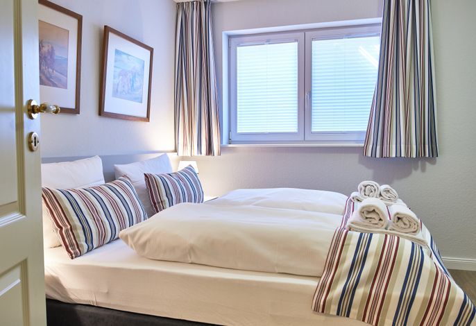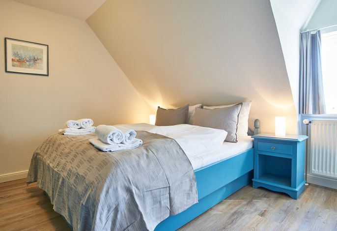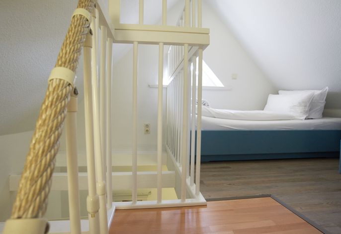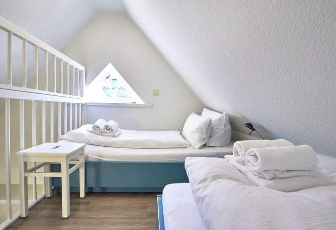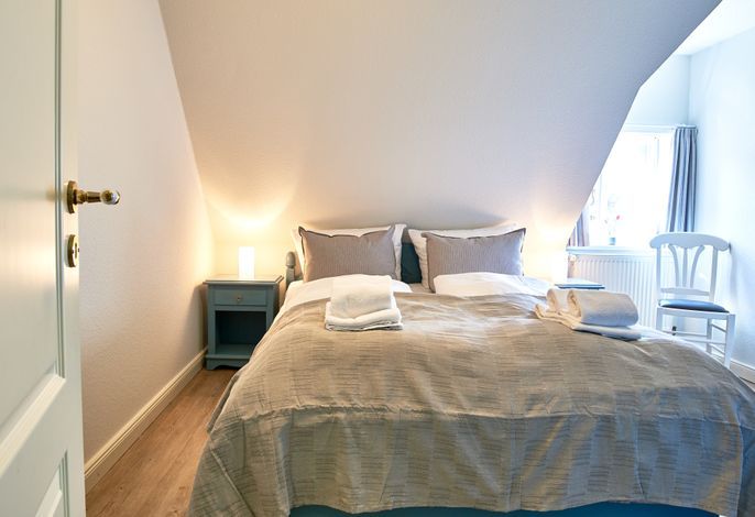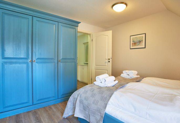 Vom Wohnzimmer gelangen Sie direkt auf die schöne Südterrasse, die im Sommer erholsame Momente nach einem erlebnisreichen Urlaubstag verspricht. Im Obergeschoss befinden sich das geräumige Bad (renoviert in 2025) mit einer flachen Dusche und Fenster sowie ein Schlafzimmer mit Doppelbett (160 x200 cm) und Kleiderschrank. Besonders Kinder lieben die zwei Einzelbetten (90x200cm) im behaglichen Dachgeschoss, die Ecke an Ecke stehen und durch Schutzgitter auch Eltern ein gutes Gefühl geben. Im Untergeschoss befinden sich das dritte Schlafzimmer mit Boxspringdoppelbett (180 x200 cm), Kleiderschrank und einem zusätzlichem TV sowie ein kleines Duschbad und der Hauswirtschaftsraum. Die Waschmaschine und der Trockner stehen Ihnen zur kostenfreien Nutzung zur Verfügung.