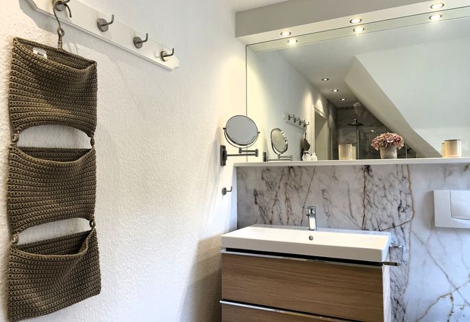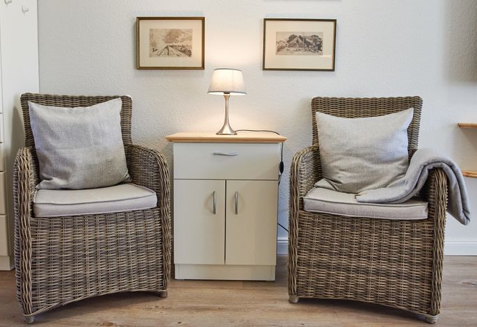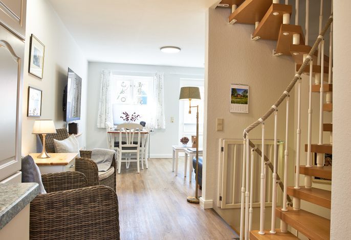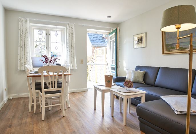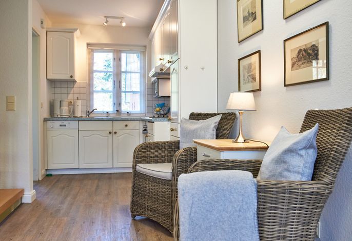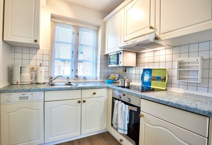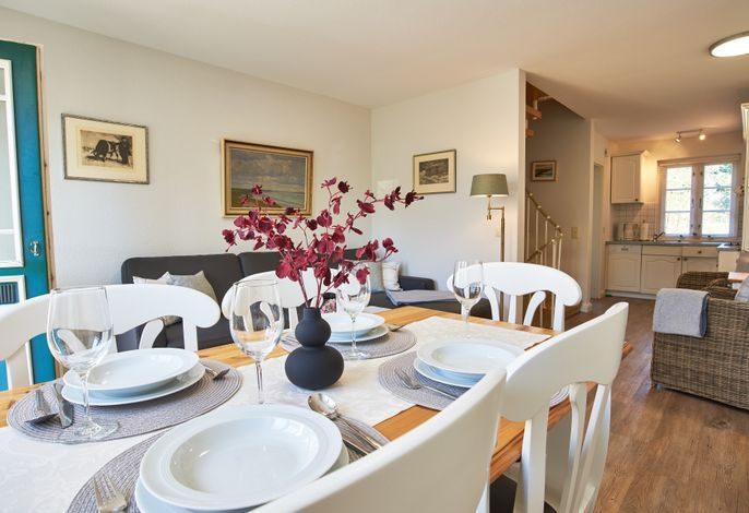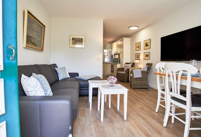 Vom Eingangsbereich gelangen Sie in die offene, gut ausgestattete Küche mit Ceranfeld-Herd mit Backofen, Kühlschrank mit Gefrierfach, einer Spülmaschine und Mikrowelle und allem, was man so benötigt. Im Anschluss hieran liegt der Wohn- und Essbereich, der gemütlich und liebevoll gestaltet wurde. Schon das Frühstück können Sie am Südfenster mit Blick zur Terrasse einnehmen. Der schwenkbare Fernseher mit Bluetooth und besonderer Audioleiste überzeugt jung und alt. Geschmackvolle Bilder und Radierungen aus der nordfriesischen Region geben dem Ganzen eine besondere Note.