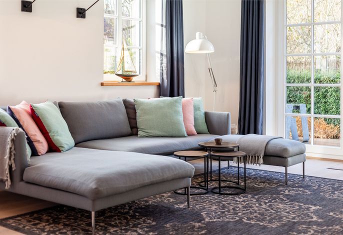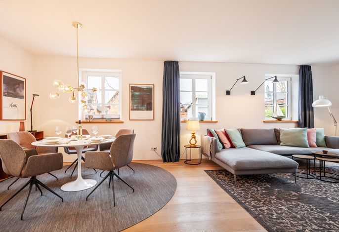 Eichenparkett, hochwertiges Mobiliar, Holzelemente und Betonoptik bilden einen harmonischen Einklang.