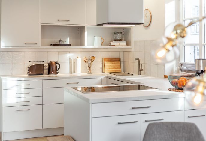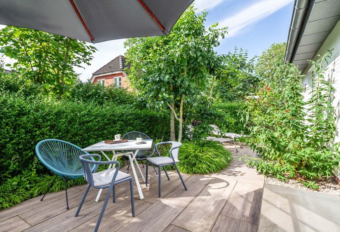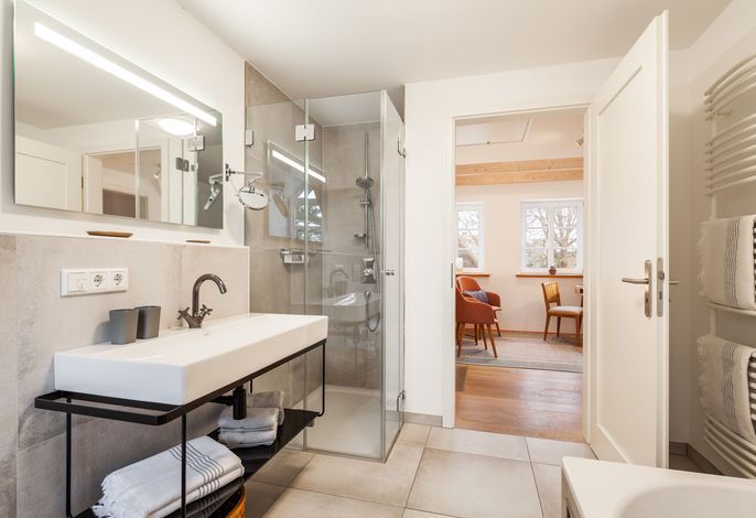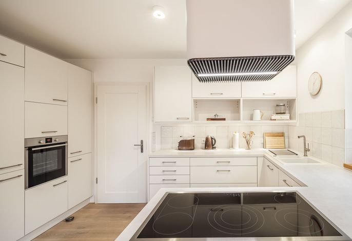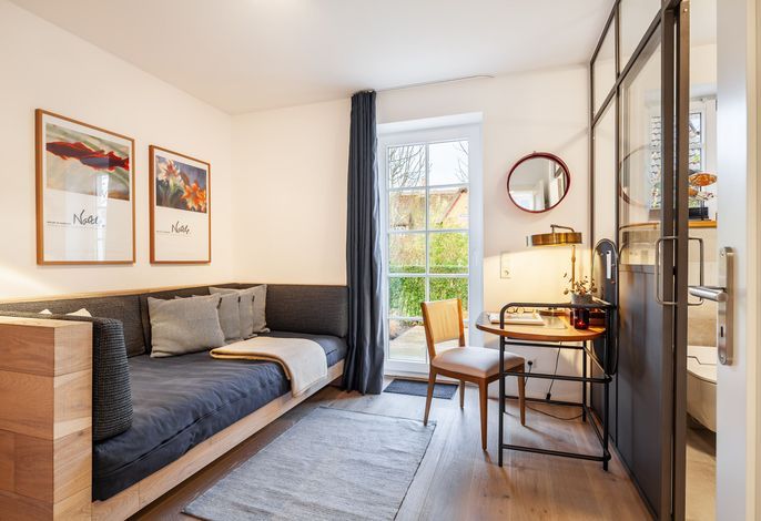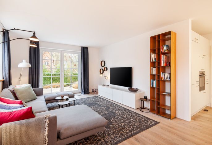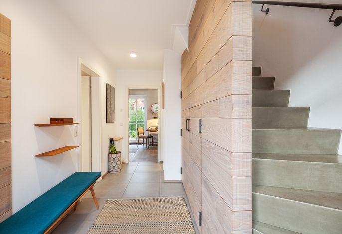 Im Erdgeschoss befinden sich der große Wohnbereich mit Zugang zur Terrasse, eine offene Küche mit Essbereich, ein Schlafzimmer/ Rückzugsort mit Dusche en suite sowie eine Gästetoilette.