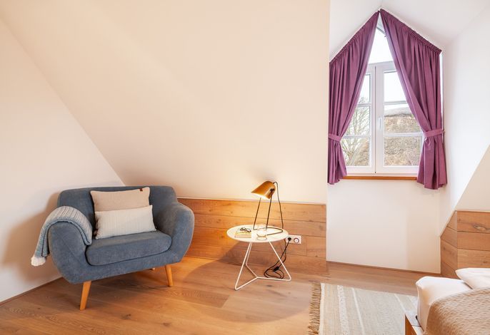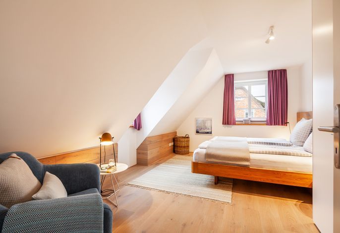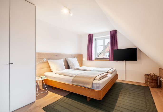 Über die Rohbetontreppe gelangen Sie in das Obergeschoss. Eine offene Galerie mit Schreibtisch, zwei Doppelschlafzimmer mit Fernseher und ein Bad mit Wanne und Dusche erwarten Sie hier.