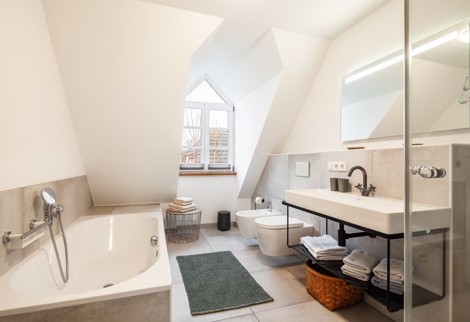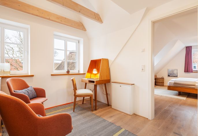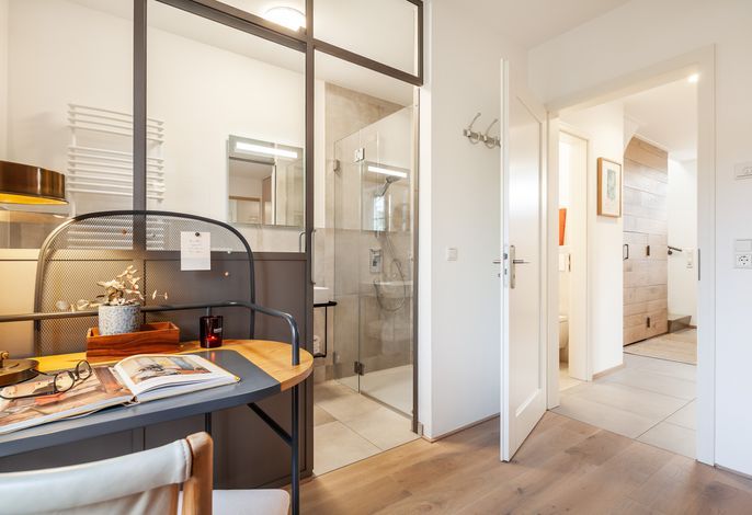Über die Rohbetontreppe gelangen Sie in das Obergeschoss. Eine offene Galerie mit Schreibtisch, zwei Doppelschlafzimmer mit Fernseher und ein Bad mit Wanne und Dusche erwarten Sie hier.