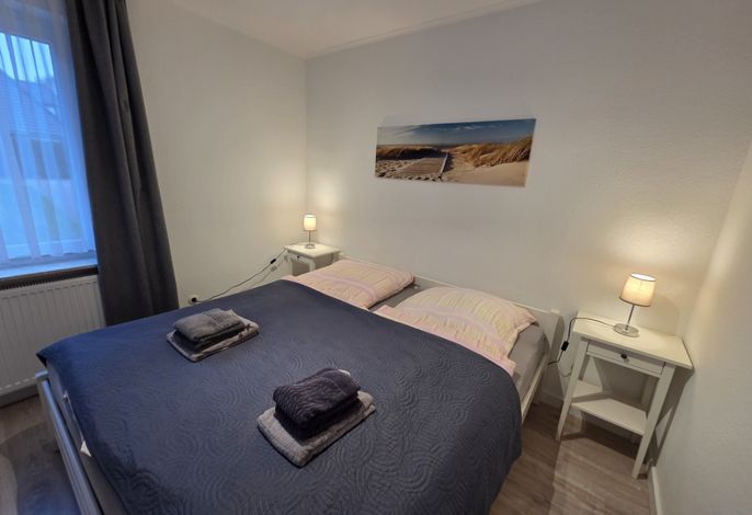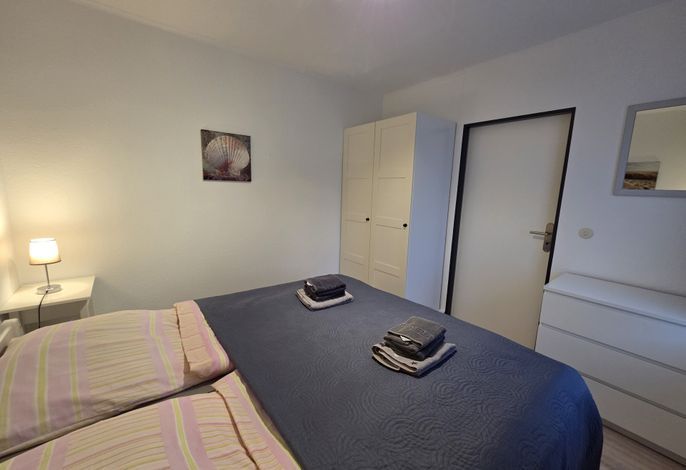 Das Schlafzimmer ist mit einem Doppelbett (1,80 × 2,00 m) sowie einem Kleiderschrank ausgestattet.