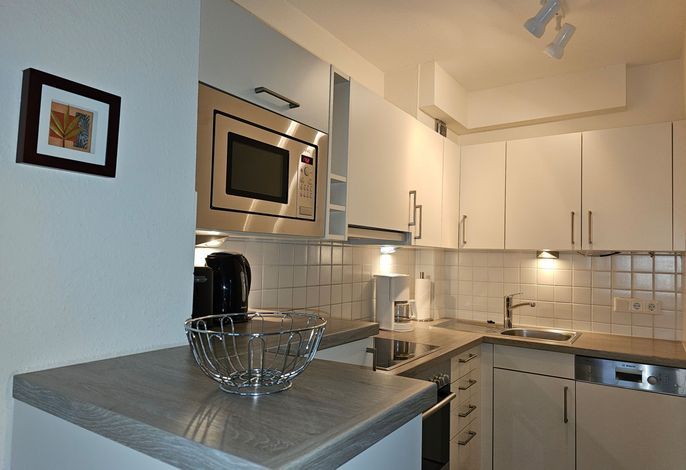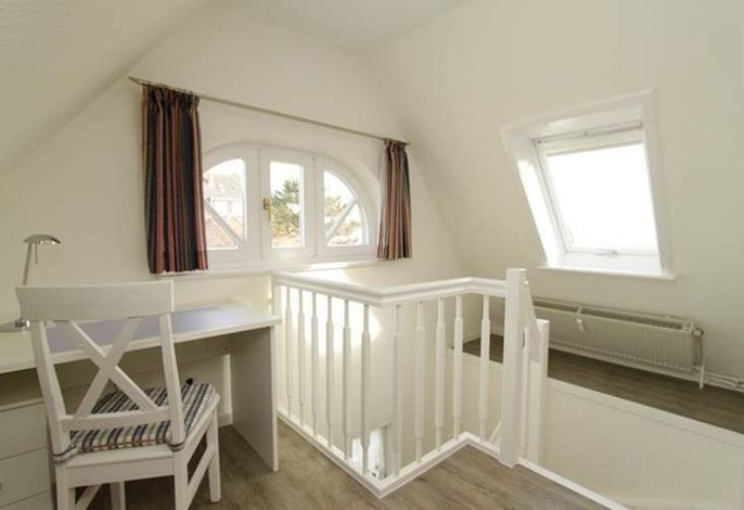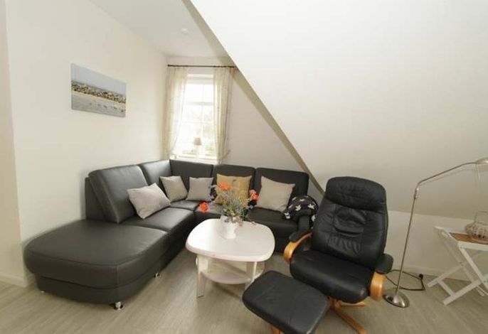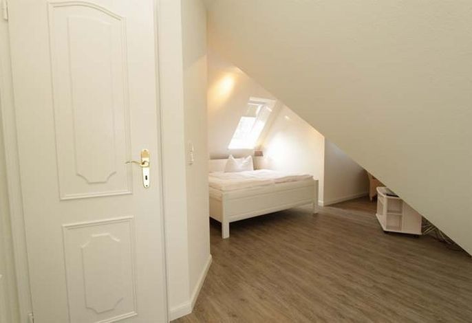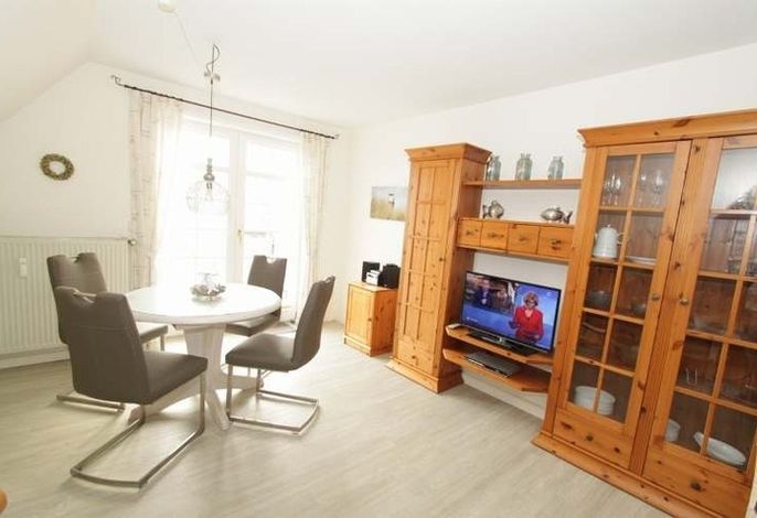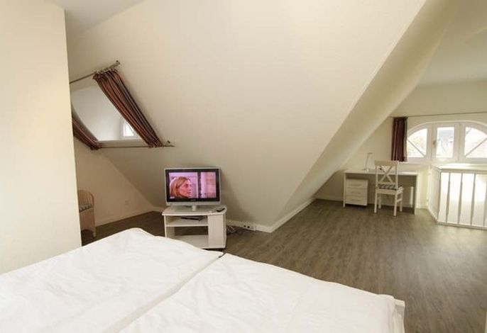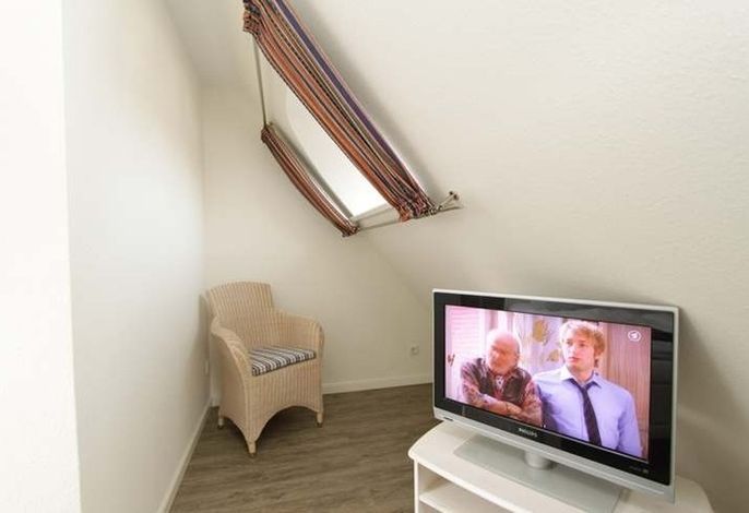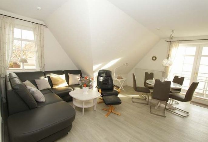 Die Wohnung befindet sich im Obergeschoss und verfügt über einen Süd-Balkon. Im Wohnbereich gibt es eine voll ausgestattete Küche mit Esstisch, eine gemütliche Couch, ein Duschbad und ein Schlafzimmer. Im Dachgeschoss ist nach oben offen das zweite Schlafzimmer mit TV und ein Gäste-WC.
