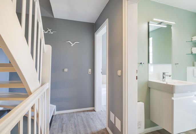 Auch die Küche mit Backofen, Herd mit Ceranfeld, Kühlschrank sowie Geschirrspülmaschine lässt keine Wünsche offen. Im Erdgeschoss befindet sich eine Gästetoilette.