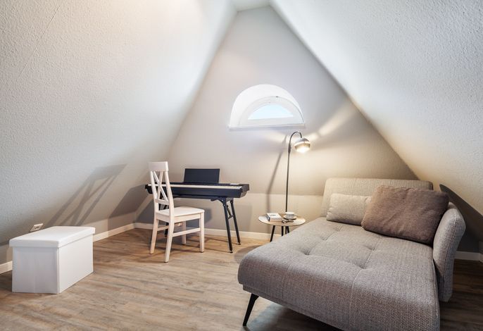 Der lichtdurchflutete Wohnraum mit einer gemütlichen Sitzgruppe und einem Esstisch lädt zum Verweilen ein. Fernseher (Flachbildschirm), Blue Ray-Player, Kaminofen und Internetanschluss sind selbstverständlich vorhanden.