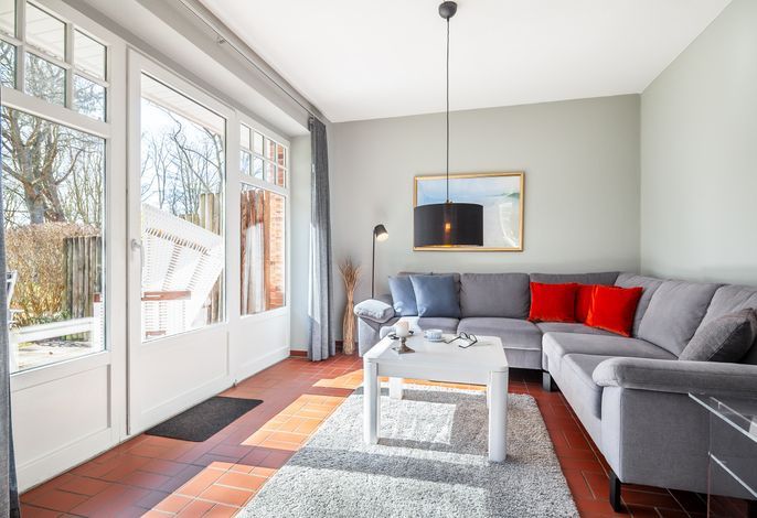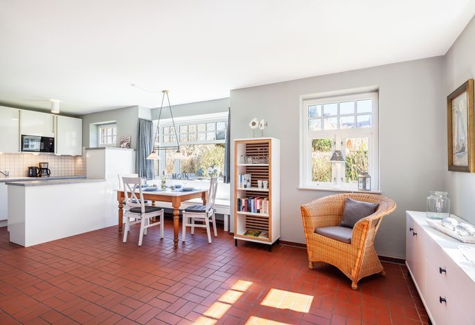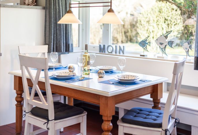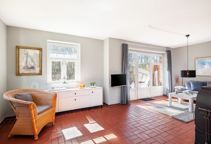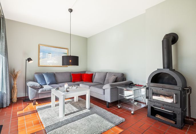 Der lichtdurchflutete Wohnraum mit einer gemütlichen Sitzgruppe und einem Esstisch lädt zum Verweilen ein. Fernseher (Flachbildschirm), Blue Ray-Player, Kaminofen und Internetanschluss sind selbstverständlich vorhanden.