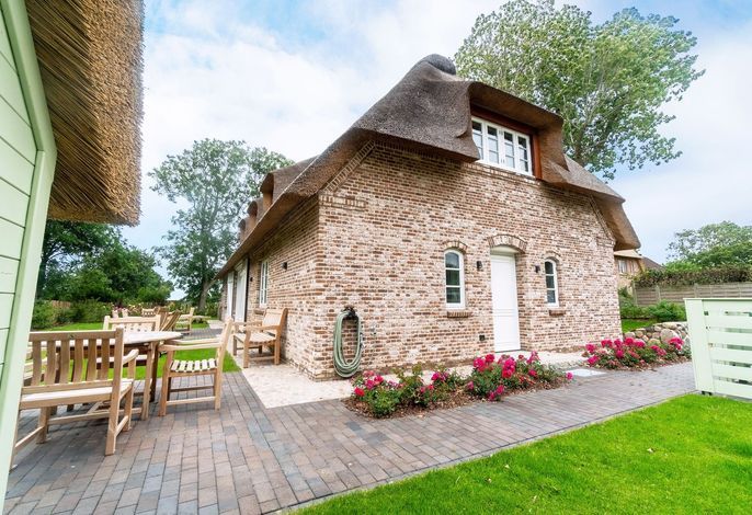 Der Außenbereich rundet das Angebot des Ferienhauses ab. Ein kleines Gartenhäuschen unter Reet steht Ihnen zur Verfügung, um E-Bikes sicher abzustellen und sie auch direkt aufladen zu können. Neben zwei Terrassenplätzen gehören auch vier Teakholz-Liegen zur Ausstattung der Außenanlage sowie zwei Sonnenschirme. Am PKW-Stellplatz finden Sie eine Ladesäule für E-Autos, die Sie während Ihres Aufenthaltes kostenlos benutzen dürfen.