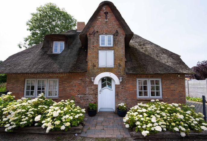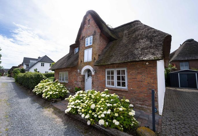 Im Erdgeschoss des freistehenden Reetdachhauses befinden sich der großzügige Wohn- und Essbereich mit offener Küche sowie ein Gäste-WC. Der Kamin im Wohnbereich sorgt auch an kühleren Tagen für eine angenehme Atmosphäre. Über den Wohnbereich gelangen Sie direkt auf die Südwestterrasse und in den eigenen Garten.