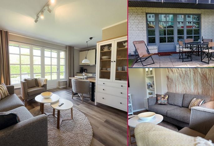Die Erdgeschosswohnung verfügt über einen Wohn- und Essbereich mit offener Küche sowie einer Schlafcouch, ein Schlafzimmer mit Doppelbett und ein Duschbad. Über den Wohnbereich gelangen Sie direkt auf die eigene Terrasse und in den gemeinschaftlich genutzten Garten.