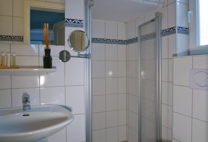 Das bequeme Doppelbett lädt zu erholsamen Nächten und süßen Träumen ein, während das kleine, funktionale Badezimmer mit Dusche und WC für frische und entspannte Urlaubsmomente sorgt.