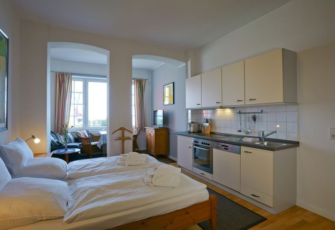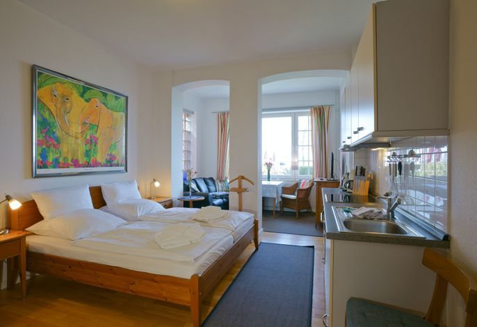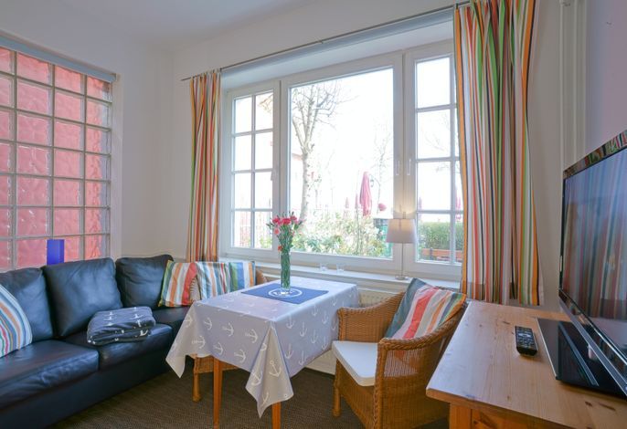 Die charmante Wohnung 01 ist ein 1-Zimmer-Apartment im Erdgeschoss und begeistert mit einer großen Fensterfront, die Ihnen einen traumhaften Meerblick bietet.