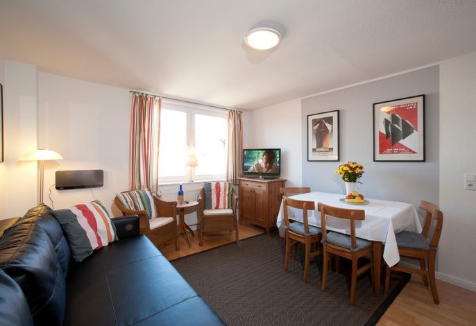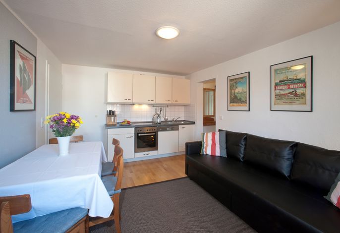 Im gemütlichen Wohnbereich erwarten Sie ein bequemes Sofa und ein einladender Esstisch - der ideale Platz für gemeinsame Mahlzeiten oder entspannte Stunden.