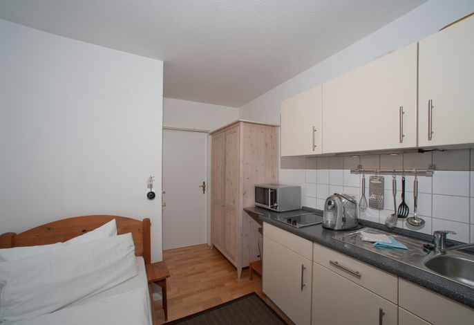 Die komplett ausgestattete Küchenzeile bietet alles, was Sie für eine unkomplizierte Urlaubsküche benötigen, während das bequeme Einzelbett für erholsame Nächte und süße Träume sorgt.