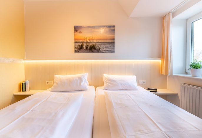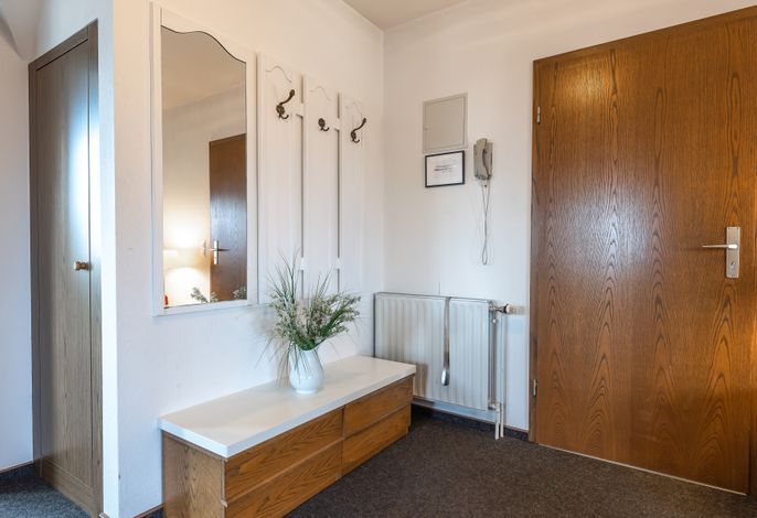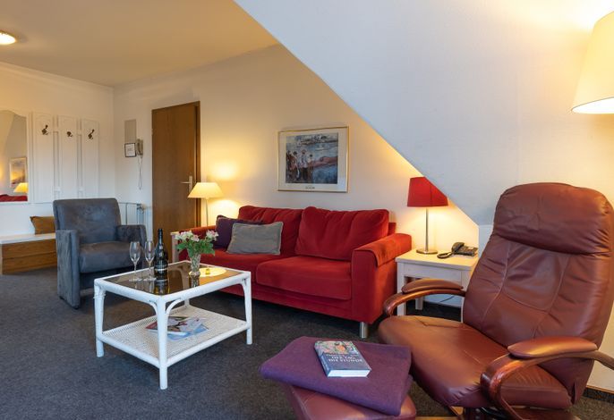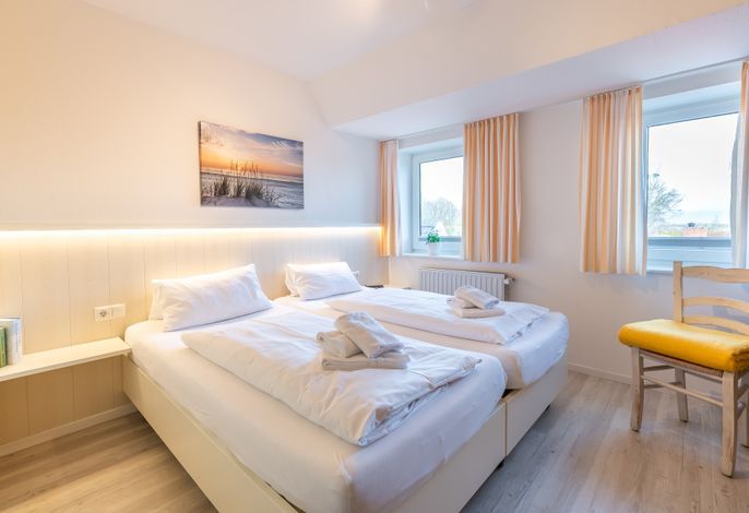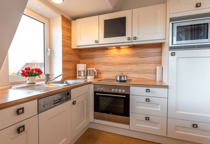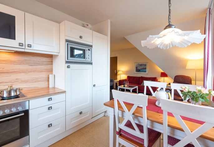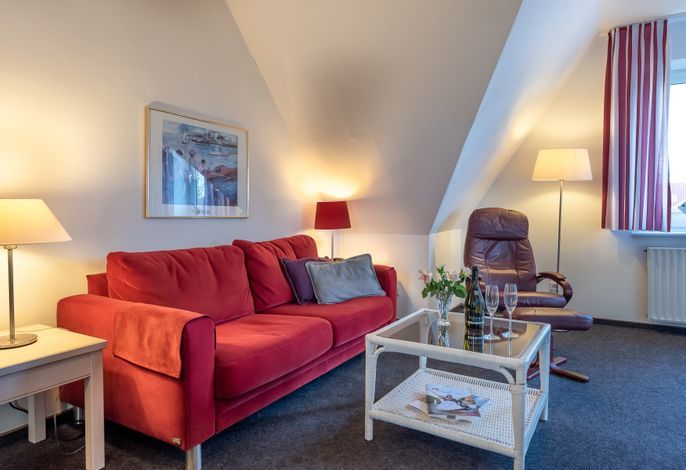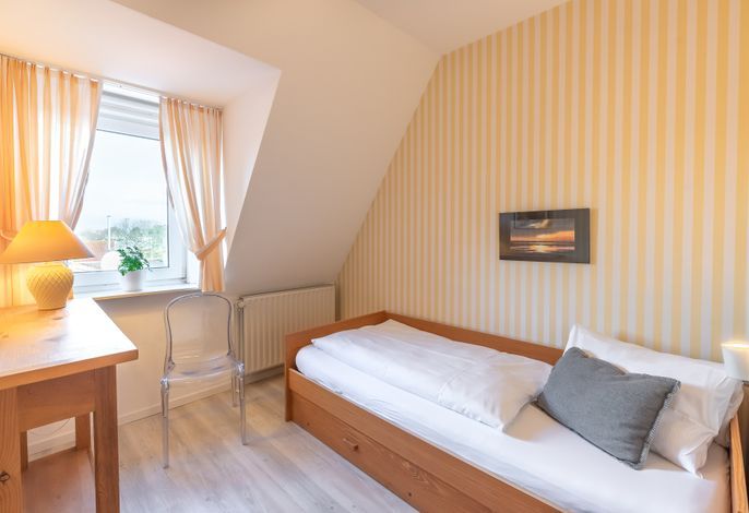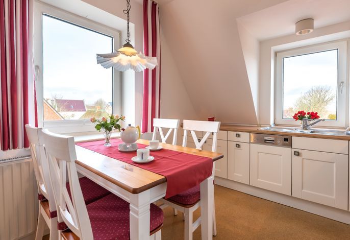 Die Wohnung Amrum im Haus in der Innenstadt befindet sich auf der zweiten Etage und ist eine ideale Wohnung für kleine Familien. 2 Erwachsene und 2 Kinder oder 3 Erwachsene können hier wunderbare Urlaubstage verbringen. Der schöne Wohnbereich mit bequemer Sitzecke, Wlan und einer gut ausgestatteten Küchenzeile mit Essplatz wirkt einladend und eignet sich ideal zum Relaxen. Das Bad ist klein, aber fein und funktinal. Des Weiteren gehört zur Wohnung ein Schlafzimmer mit Doppelbett und ein weiterer Schlafraum mit einem Einzelbett, bei dem man eine zusätzlich Matratze auf Bodenhöhe herausziehen kann. Aus diesem Grund eignet sich dieser Schlafraum entweder für eine erwachsene Person oder für 2 Kinder. Viele liebevolle Details geben der Wohnung einen ganz besonderen Charme. Ein eher seltener Luxus bei Wohnungen in der Innenstadt ist der wohnungseigene Parkplatz. Die Fahrräder können bei den Fahrradständern auf dem Hof abgestellt werden und wenn Sie waschen möchten, gibt es einen Waschsalon in derselben Straße. Die zentrale Lage lädt zu Stadtbummeln, Café trinken oder einem abendlichen Spaziergang in der Wyker Innenstadt ein- doch natürlich ist der größte Vorteil der Strand, der in wenigen Minuten erreichbar ist. Wir freuen uns darauf, Sie bei uns begrüßen zu dürfen!