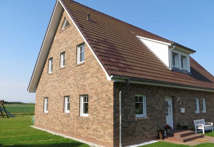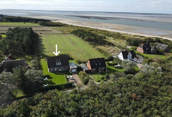 Einfamilienhaus (Baujahr 2011) in exponierter + sehr ruhiger Lage in unmittelbarer Strandnähe (100 m), Garten + Sitzecken, unverbauter Ausblick in die grüne Natur, auf das Meer + zur Nachbarinsel Amrum!