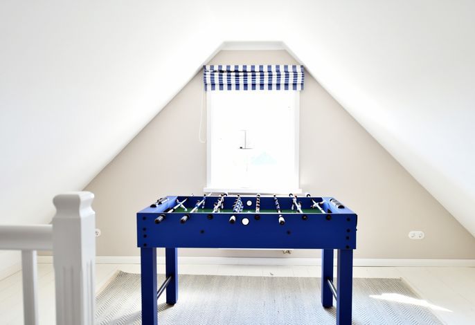 Der ausgebaute Spitzboden lädt zum Faulenzen ein: Lümmelecke, Fernseher und Kicker stehen zur Verfügung.
