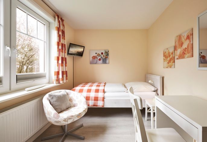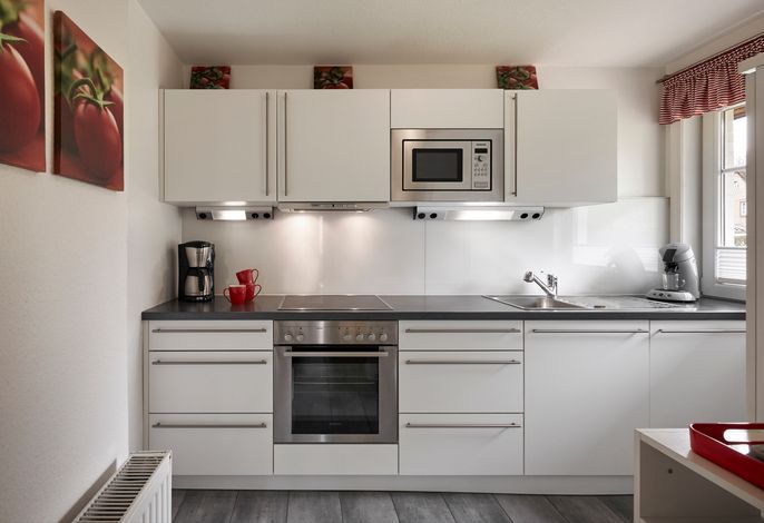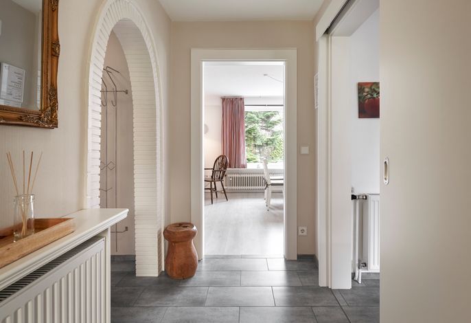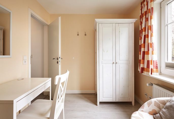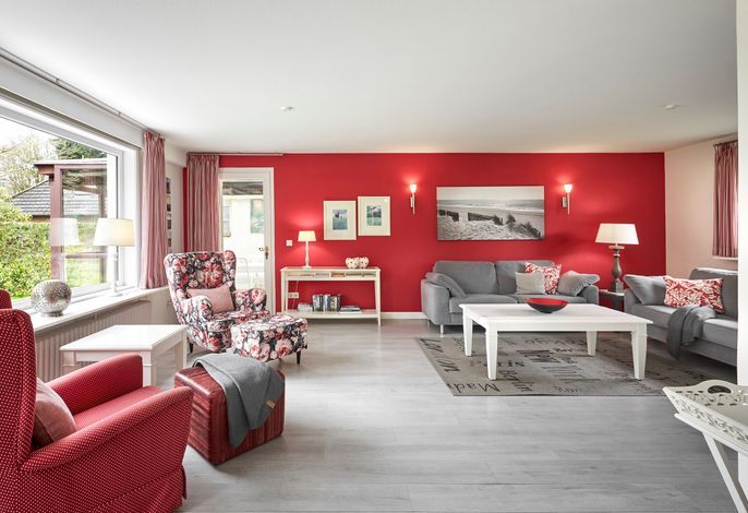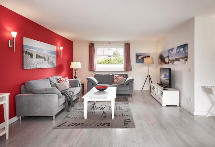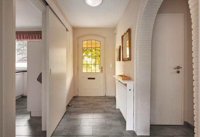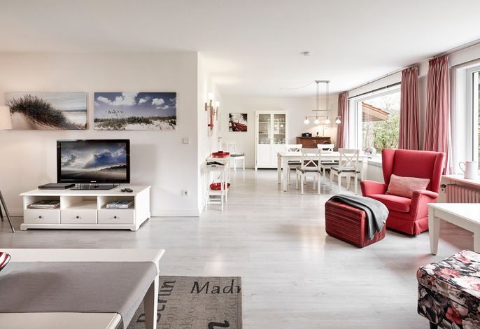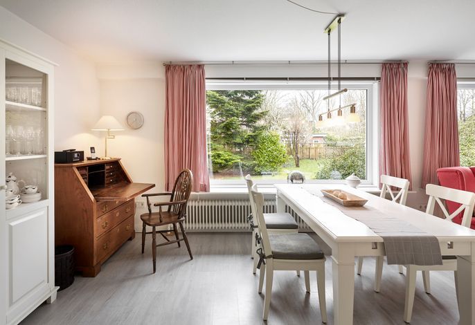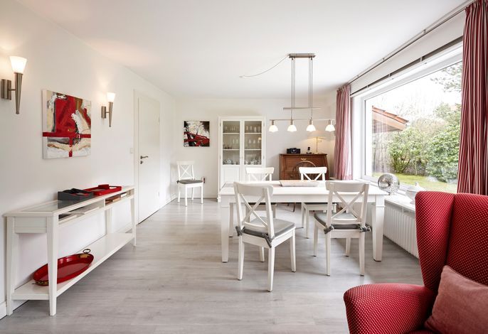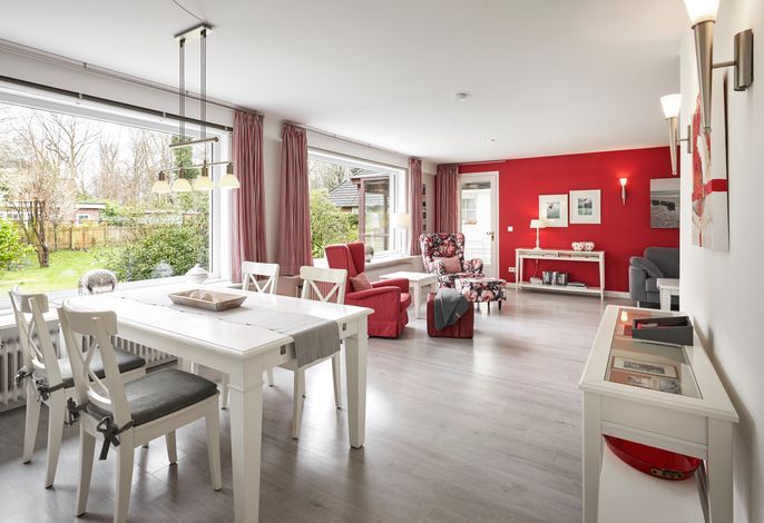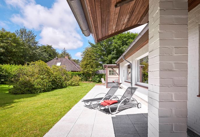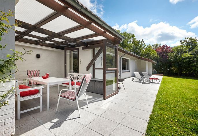 In diesem Einzelhaus im Bungalowstil werden Sie einen wunderbaren Urlaub genießen. Vom großen Wohn-Esszimmer gelangen Sie über eine überdachte Terrasse direkt in den Garten. Sollte also mal ein kurzer Schauer das Grillvergnügen trüben, sitzen Sie geschützt im Freien. Möchten Sie den Tag nicht im eigenen Garten verbringen, machen Sie sich auf den Weg zur Strandpromenade. In nur wenigen Minuten gelangen Sie zu Fuß oder auch per Rad zum Wasser. Angelehnt ist der Grünstreifen an einen Wald, welcher mit wunderschönen Wegen zum Spazierengehen einlädt.