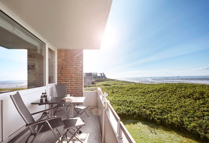 Haus Langeneß erste Reihe am Meer. Wohnen Sie in Traumlage mit absolut einmaligem Blick auf die Nordsee und die Halligen. In der Wohnung 18 im ersten Obergeschoss mit Südbalkon haben Sie genau diesen Blick. Ein kleiner Pfad...