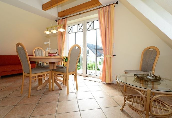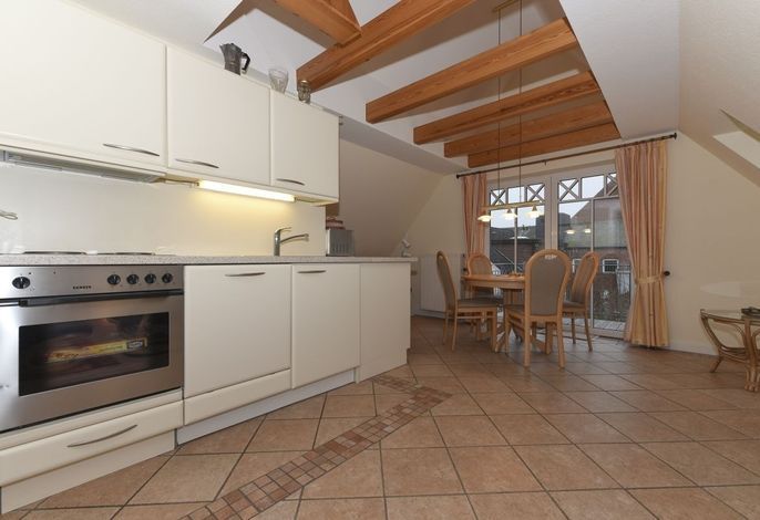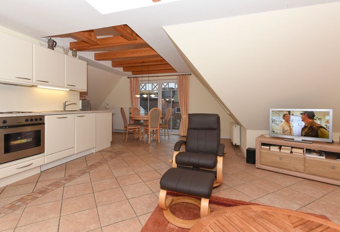 Das großzügige, lichtdurchflutete Wohnzimmer der Wohnung 05 ist geschmackvoll eingerichtet und lädt zum Entspannen ein. Vom seitlichen Balkon aus können Sie den herrlichen Meerblick genießen – der perfekte Ort, um den Tag zu beginnen oder bei Sonnenuntergang zu entspannen. Die offene, vollständig ausgestattete Küche fügt sich harmonisch in den Wohnbereich ein und bietet alles, was Sie für Ihre Mahlzeiten benötigen. Der sonnige Esstisch ist der ideale Platz für gemeinsame Mahlzeiten und gemütliche Stunden.