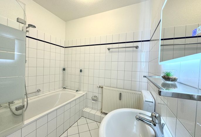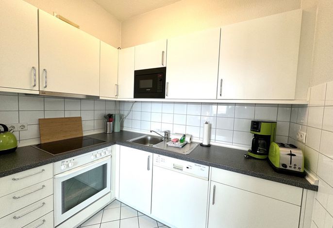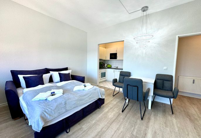 In dieser Ferienwohnung befindet sich ein großzügiger Wohnzimmer- und Schlafbereich mit einem hochwertigen Federkern-Schlafsofa mit Nachttischen. Zwei gemütliche Loungesessel bieten für Sundowner-Abende entspannte Wohlfühlatmosphäre. Ein kleiner Essbereich runden diesen Wohnbereich mit Sat-TV ab. Angrenzend befindet sich der Küchenbereich mit umfangreichen Kochutensilien, Geschirr und Besteck, einen 4-Platten Ceranfeld Herd mit Ofen, Kühlschrank mit kleinem Gefrierfach, Kaffeefiltermaschine, Toaster und Wasserkocher, Mikrowelle sowie eine Geschirrspülmaschine. Ein Wannenbad mit Bade- und Duschamatur schließt sich dem Eingangflurbereich mit Garderobe an.