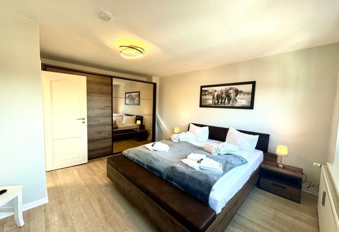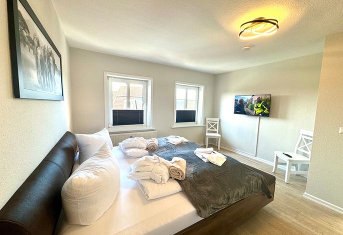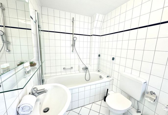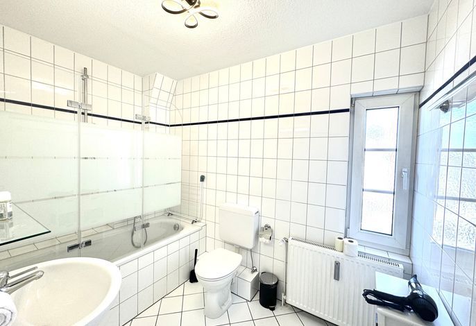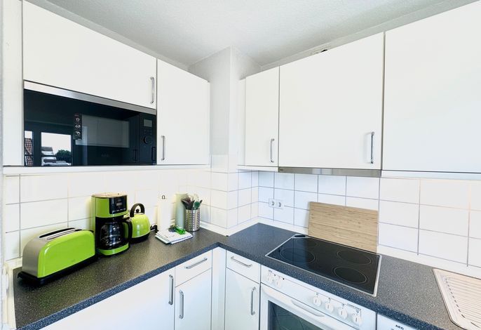 In dieser Ferienwohnung befindet sich ein geräumiges Schlafzimmer mit Boxspring-Doppelbett und SAT-TV. Ebenso vom Flur ausgehend erreichen Sie das helle Wannenbad mit Bade- und Duschamatur und WC. Die Küche bietet neben umfangreichen Kochutensilien, Geschirr und Besteck einen 4-Platten Ceranfeld Herd und Ofen, Kühlschrank mit kleinem Gefrierfach, Kaffeefiltermaschine, Toaster und Wasserkocher, Mikrowelle sowie eine Geschirrspülmaschine.