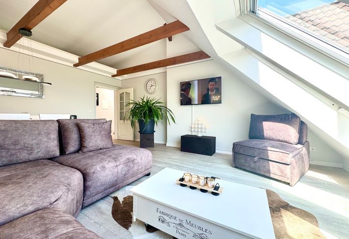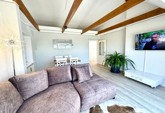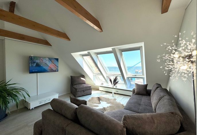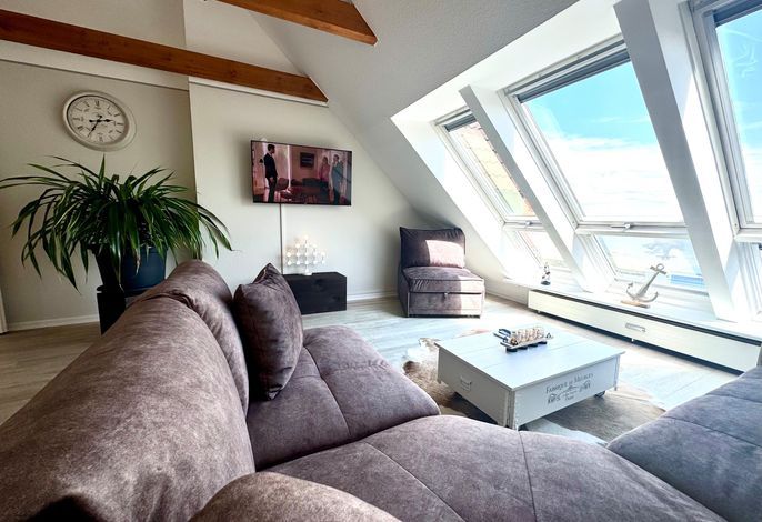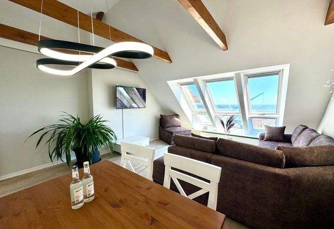 Im sonnengefluteten Wohnzimmerbereich genießen Sie gemütliche Abende auf der Eckcouch und bietet Zeit zum Entspannen mit SAT-TV. Auch vom Esstisch aus erfahren Sie den weiten Blick über die Nordsee.