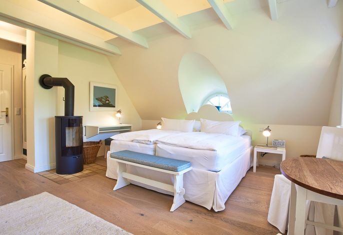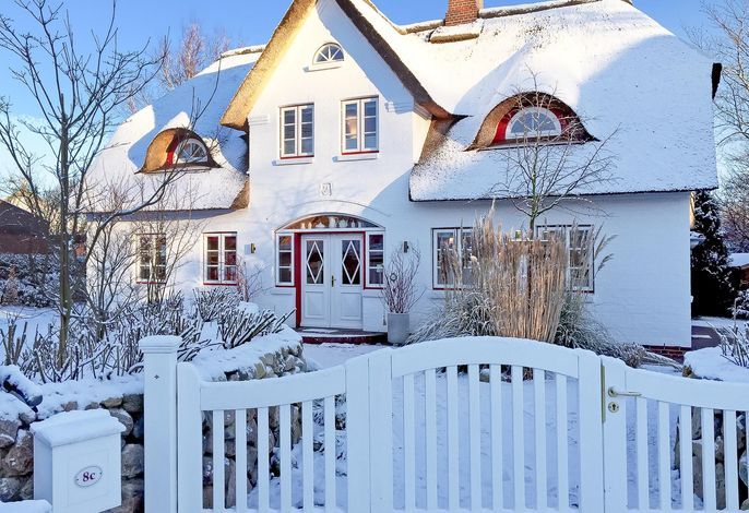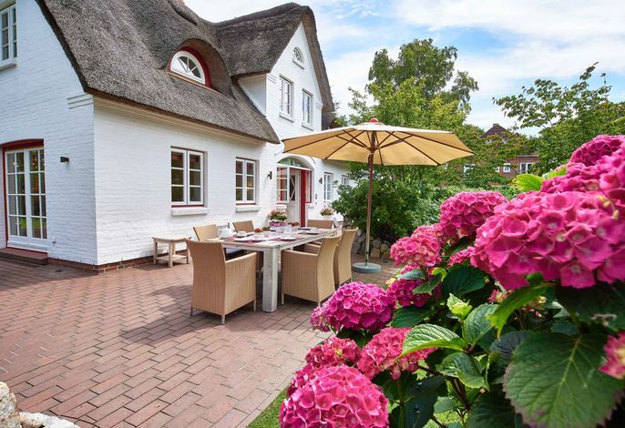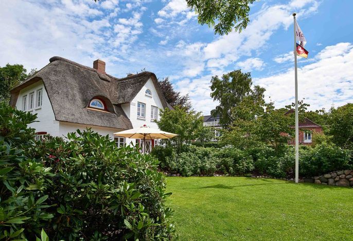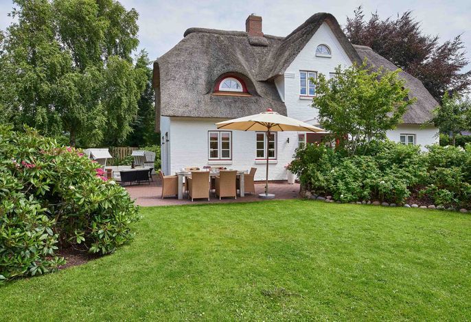 Entdecken Sie das versteckte märchenhaft im Herzen von Wyk gelegene Einzelhaus unter Reet, das idyllisch und sehr ruhig in zweiter Reihe nur von Gärten umsäumt auf einem ca. 1.000 m2 eingewachsenen Grundstück liegt. Der wunderschön angelegte Garten bietet durch innere Friesenwälle viel Privacy und durch Illumination am Abend eine außergewöhnliche Atmosphäre. Die stilvolle Einrichtung der Villa ist ein stimmiger Mix aus modernen Möbeln und antiken Einzelstücken. Genießen Sie die exklusiven Bäder und den Besuch in der geräumigen Gartensauna. Sie werden sich sicher gern an die gemütlichen Abende vor dem historischen Kachelofen im Wohnzimmer erinnern. Auch zwei der geräumigen Schlafräume sind mit je einem Panorama-Ofen ausgestattet. Nur ein kurzer Fußweg führt Sie zu den Einkaufsmöglichkeiten und der Promenade mit Badestrand, Bars und Cafes.