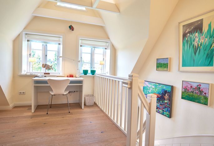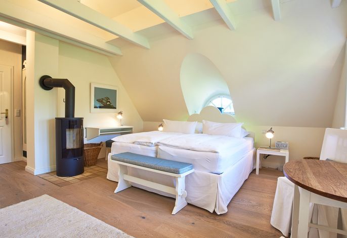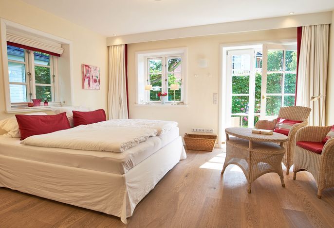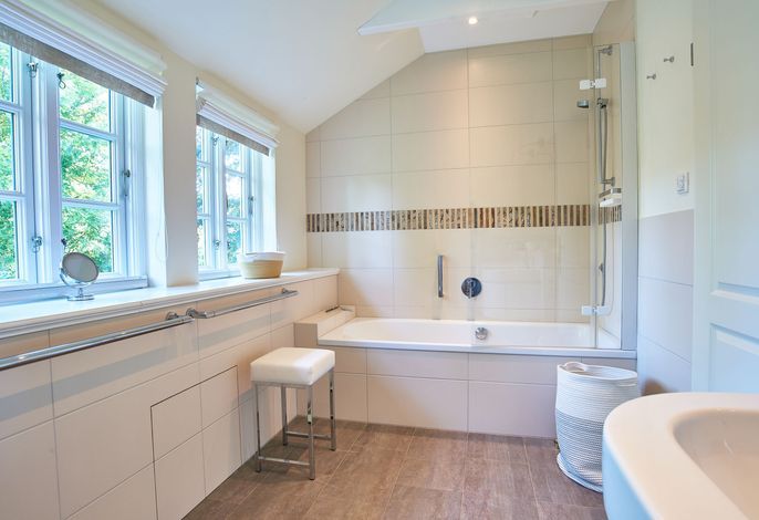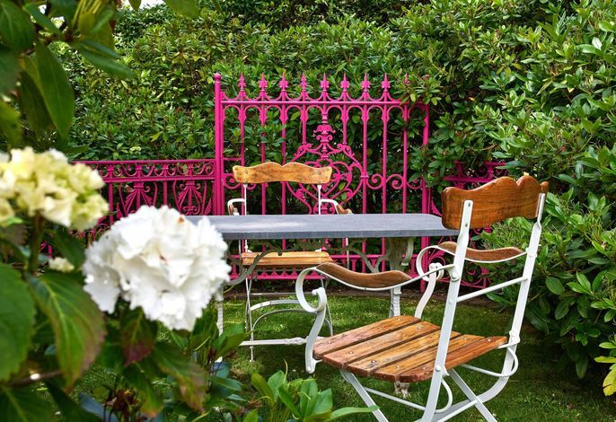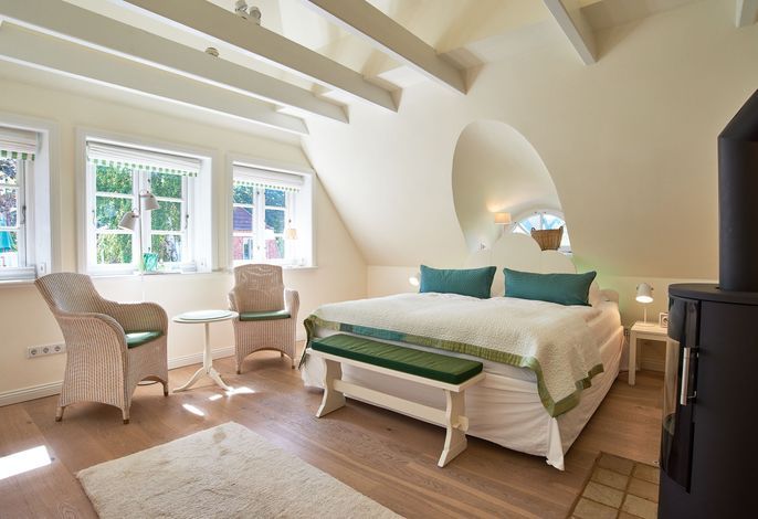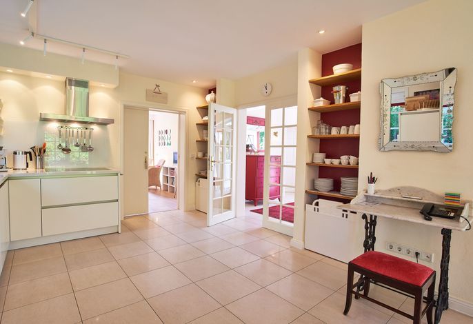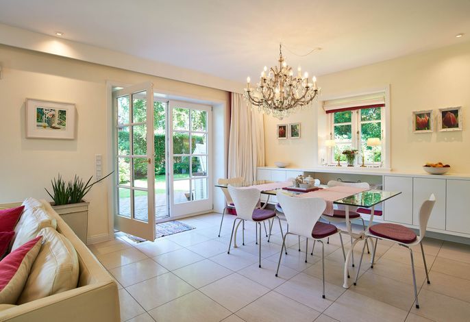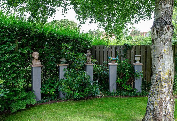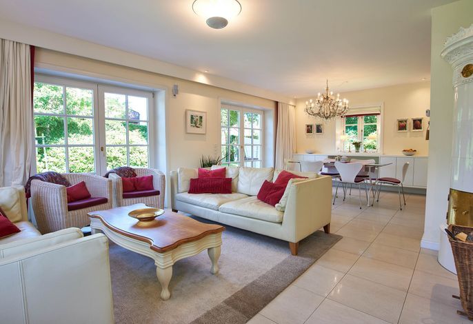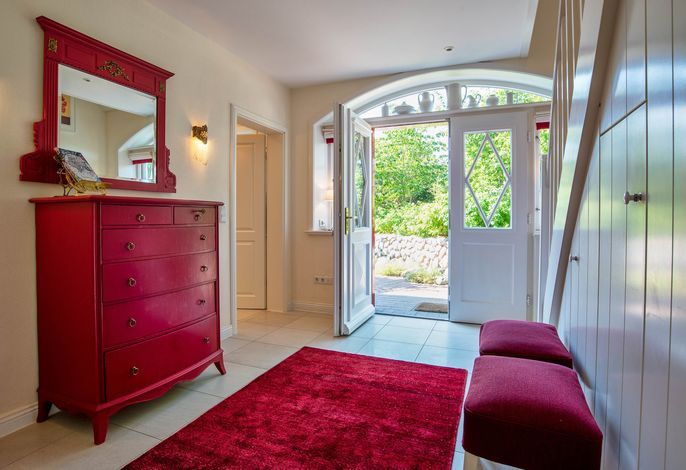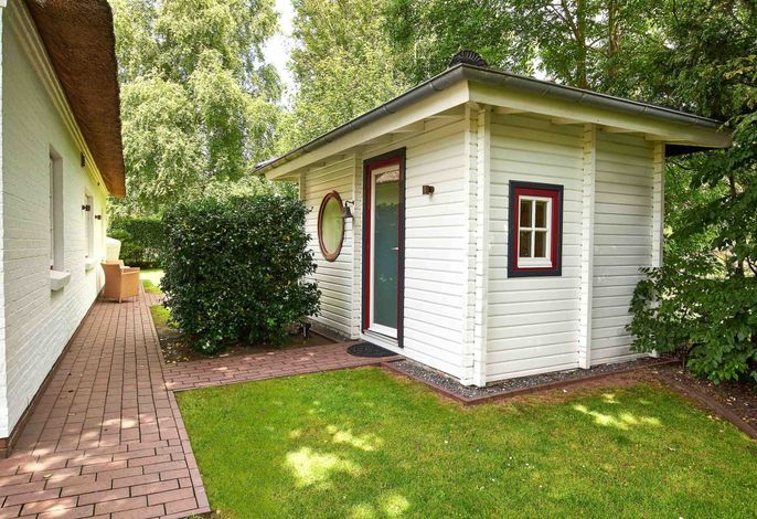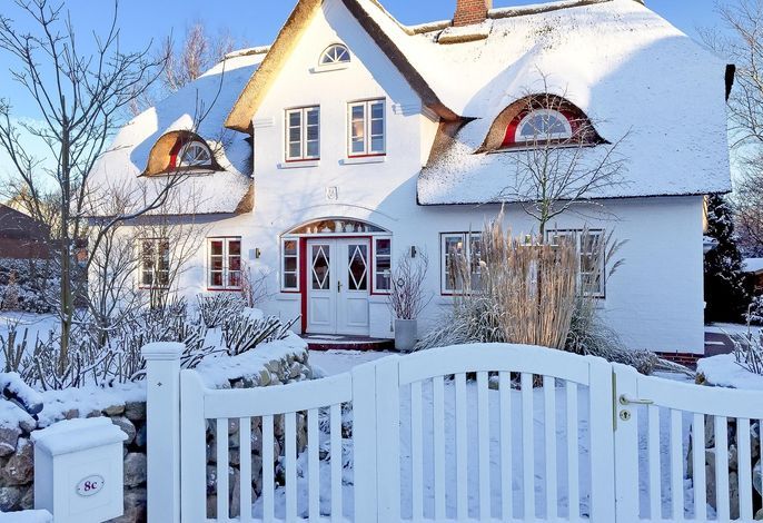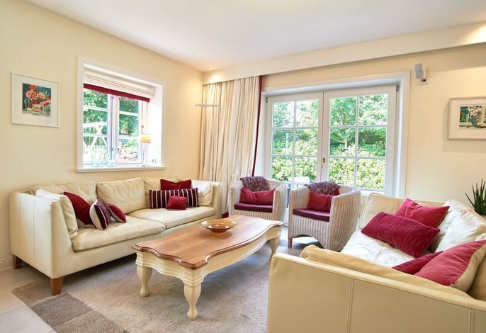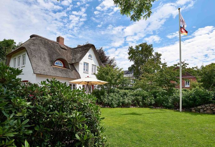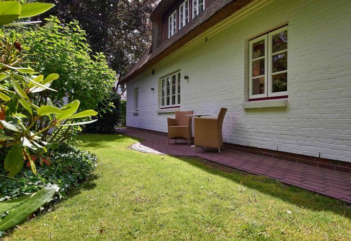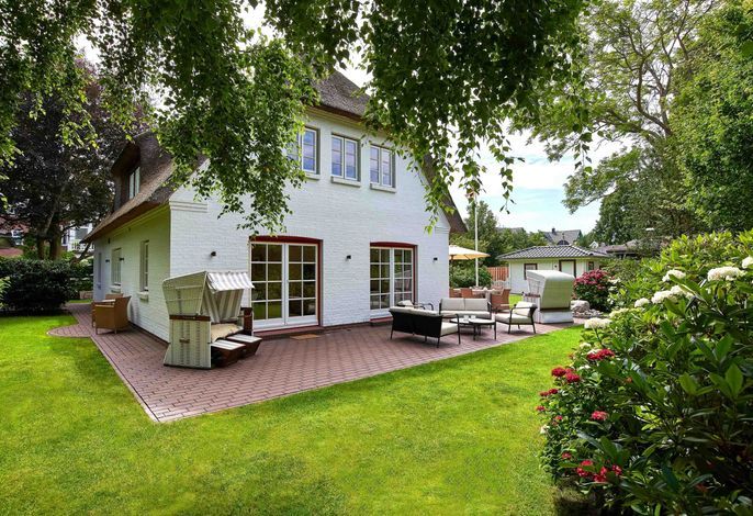 Entdecken Sie das versteckte, märchenhaft im Herzen von Wyk gelegene Einzelhaus unter Reet, das idyllisch und sehr ruhig in zweiter Reihe nur von Gärten umsäumt auf einem ca. 1.000 m2 großen, eingewachsenen Grundstück liegt. Der wunderschön angelegte Garten bietet durch innere Friesenwälle viel Privatsphäre und durch Illumination am Abend eine außergewöhnliche Atmosphäre. Die stilvolle Einrichtung der Villa ist ein stimmiger Mix aus modernen Möbeln und antiken Einzelstücken. Genießen Sie die exklusiven Bäder und den Besuch in der geräumigen Gartensauna. Sie werden sich sicher gern an die gemütlichen Abende vor dem historischen Kachelofen im Wohnzimmer erinnern. Auch zwei der geräumigen Schlafräume sind mit je einem Panoramaofen ausgestattet. Nur ein kurzer Fußweg führt Sie zu den Einkaufsmöglichkeiten und der Promenade mit Badestrand, Bars und Cafes.