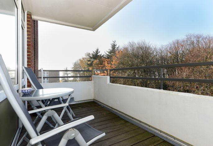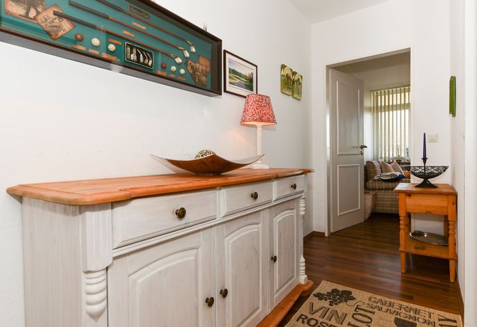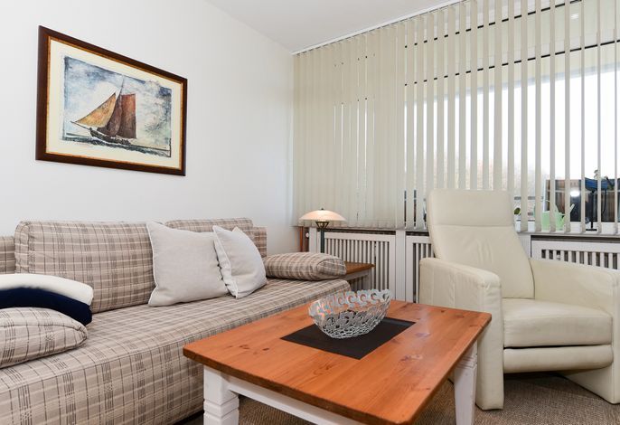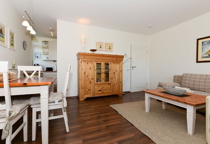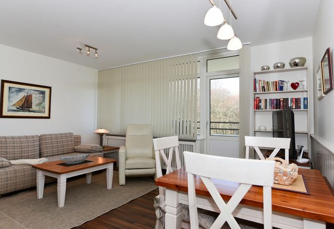 Die Wohnung befindet sich in ruhiger Lage, nur wenige Schritte vom Strand entfernt, und überzeugt durch helle Möbel und dunkles Laminat, die für eine gemütliche Atmosphäre sorgen. Im Wohnzimmer können Sie sich auf modernen Komfort freuen: Ein Flachbildschirm und ein DVD-Player sorgen für Unterhaltung, und das Sofa lässt sich mit wenigen Handgriffen in eine zusätzliche Schlafgelegenheit verwandeln. Der Essbereich für drei Personen fügt sich harmonisch in den Raum ein. Vom Wohnzimmer aus gelangen Sie direkt auf den Balkon, von dem aus Sie den Blick auf die Nordsee genießen können.