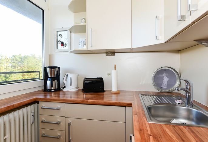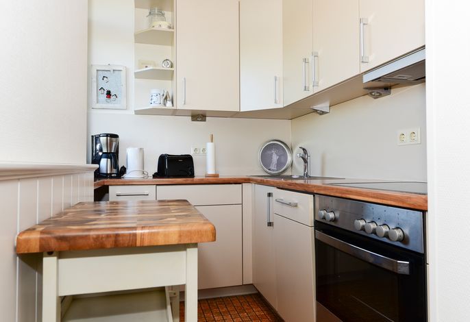 Die separate, kleine Küche ist komfortabel ausgestattet mit Ceranfeld, Spülmaschine, Backofen und Kühlschrank mit Gefrierfach – hier können Sie ganz nach Belieben Ihre Mahlzeiten zubereiten.