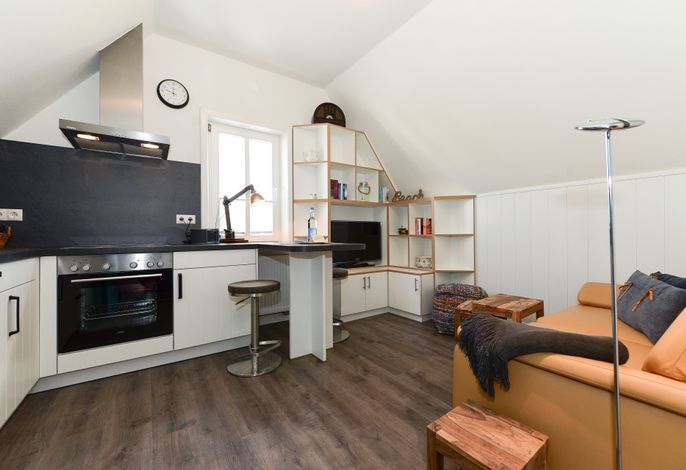 Renoviert im Frühjahr 2019, erwartet Sie hier ein moderner Wohnbereich mit offener Küche und gemütlicher Sofaecke.