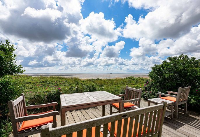 Unmittelbar am Meer gelegen, mit eigenem Terrassenplatz in den höhergelegenen Dünen am Südstrand von Wyk, genießen Sie absolut sichtgeschütz den Blick auf die Nordsee und die Halligwelt bis zum Leuchtturm von Amrum. Haus...