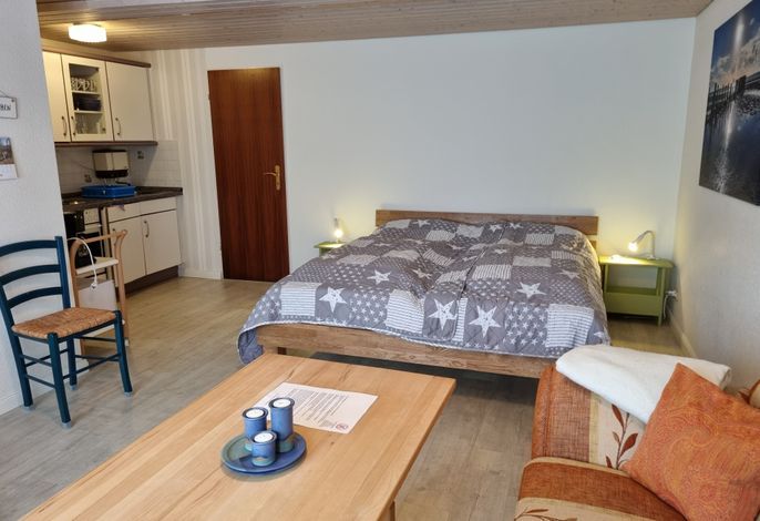 Dieses gemütliche 30 qm große Appartement im Untergeschoss im Haus Rosi ist eine von drei Ferienwohnungen in dem Haus und liegt im Nachbardorf Boldixum zu Wyk. Die Wohnung bietet Platz für bis zu 2 Personen. Durch einen kleinen Vorflur gelangen Sie in das Appartement. Dort befindet sich neben einer kleinen Küchenzeile eine gemütliche Sitzecke mit höhenverstellbarem Tisch zum Essen und ein Schrankbett, welches problemlos auf- und abzubauen geht. Das helle Badezimmer verfügt über eine Dusche, WC und Waschbecken. Bettwäsche und Handtücher sind für 25€ pro Person inklusive. WLAN steht Ihnen kostenfrei zur Verfügung.