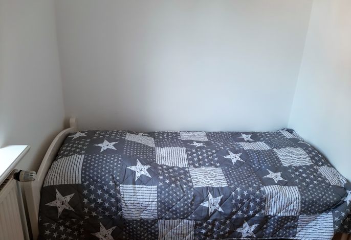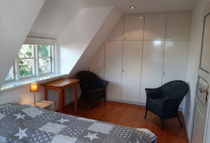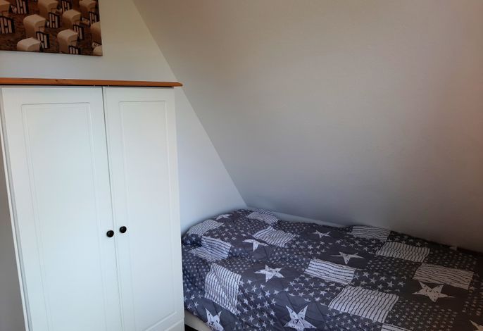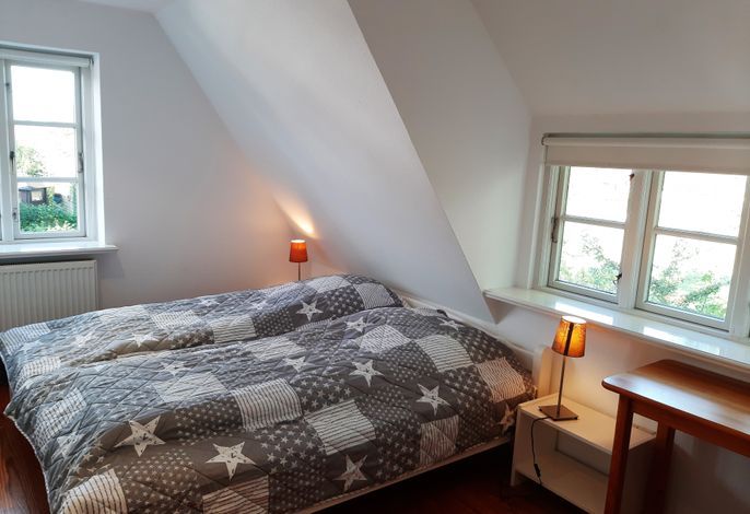 Im ersten Obergeschoss befindet sich das Hauptschlafzimmer mit einem Doppelbett (1,80 x 2,00 m) und einem geräumigen Einbaukleiderschrank. Ein Kinderbett kann problemlos im Schlafzimmer aufgestellt werden. Das angrenzende Kinderzimmer verfügt über zwei Einzelbetten (0,90 x 2,00 m). Das Duschbad liegt ebenfalls auf dieser Etage.