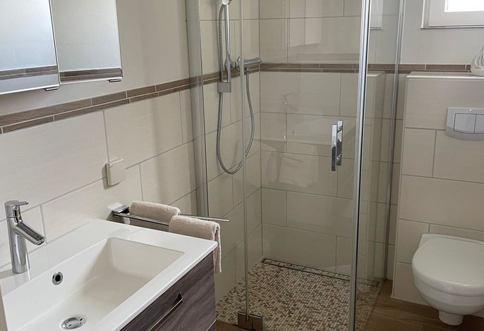 Das  Badezimmer ist mit einer ebenerdigen Dusche bestückt.