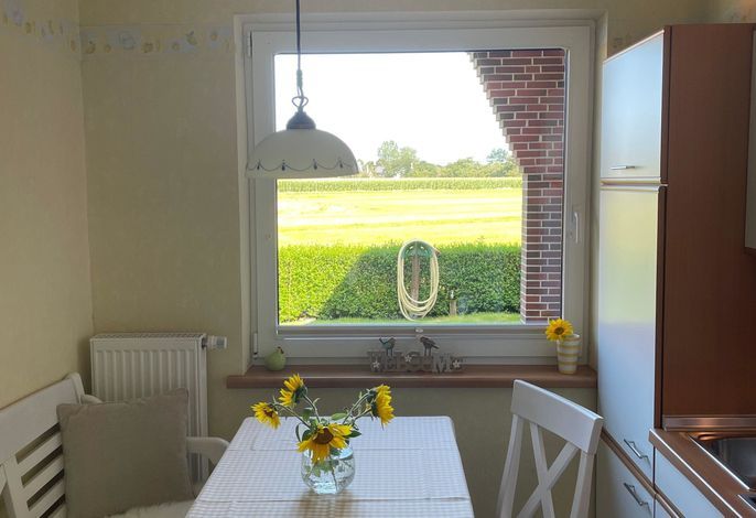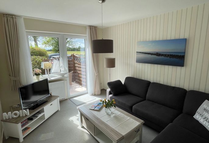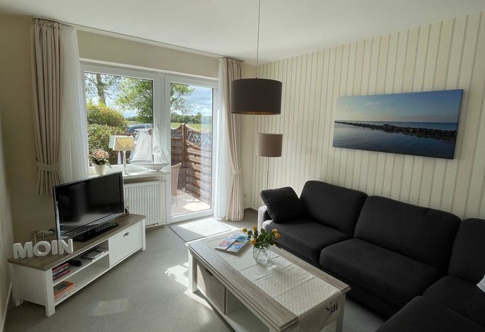 Die gemütlich eingerichtete Ferienwohnung mit Terrasse, ist nach Süden ausgerichtet .