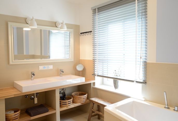 Ein großzügiges Badezimmer mit einer Badewanne, die Lichttherapie bietet, sowie eine Regendusche lädt im Erdgeschoss zum Entspannen ein.