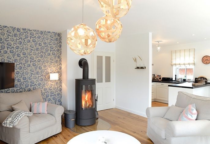 Ein dänischer Ofen sorgt an kühleren Tagen für wohlige Wärme, während die bodentiefen Fenster den Raum mit Tageslicht durchfluten.