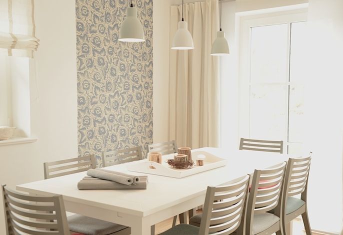 Der Esstisch ist ideal für gesellige Runden, und die offene, moderne Küche lässt auch Hobbyköche Herzen höher schlagen.