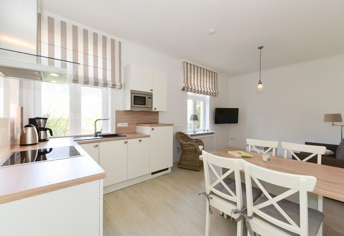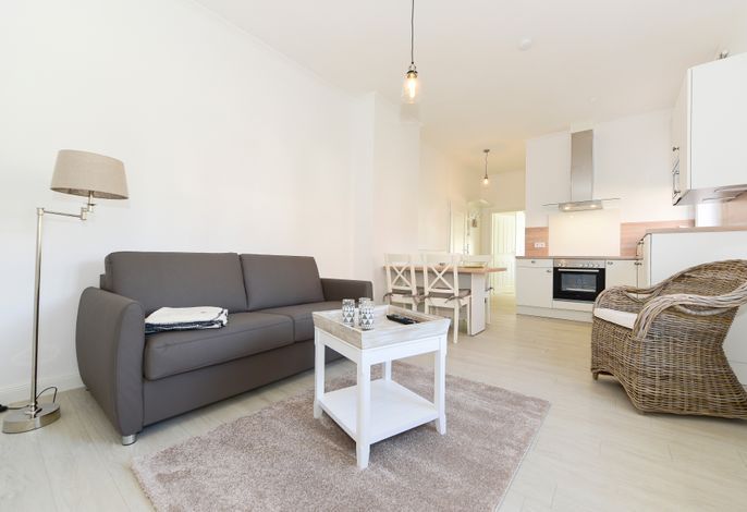 Das helle 2-Raum-Apartment wurde im Frühjahr 2018 liebevoll renoviert und bietet eine harmonische Verbindung von Wohn-, Ess- und Küchenbereich. Das gemütliche Sofa lässt sich schnell in eine zusätzliche Schlafgelegenheit verwandeln, und der Flachbildfernseher sorgt für moderne Unterhaltung. Der Esstisch bietet Platz für gemeinsame Mahlzeiten oder gesellige Abende mit Familie oder Freunden.